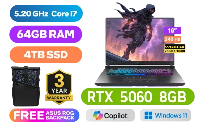 [G-SYNC] ASUS ROG Strix G16 Intel Core i7-14650HX up to 5.20GHz Processor, 30MB Cache, 16x Cores, 24x Threads / 64GB DDR5 RAM / 4TB Ultra-Fast NVMe SSD / 16" WQXGA (2560 x 1600) 240Hz Anti-Glare IPS Display / NVIDIA 50 Series GeForce RTX 5060 8GB GDDR7 Graphics Card / 1080P FHD IR Camera / Windows 11 Home (64bit) / Intel Wi-Fi 7 BE200 Wireless LAN / Bluetooth 5.4 / 3 x USB Type-A / 2x USB Type-C (Thunderbolt™ 4, DisplayPort™ / power delivery) / 1 x HDMI / 1 x Headphone and Microphone Audio Combo Jack / 1x RJ-45 / RGB Backlit Keyboard / Dolby Atmos Audio with Smart Amp Technology / FREE ASUS ROG Backpack / ASUS ROG Strix G16 G615JMR Core i7 RTX 5060 Gaming Laptop Deal[G-SYNC] ASUS ROG Strix G16 Intel Core i7-14650HX up to 5.20GHz Processor, 30MB Cache, 16x Cores, 24x Threads / 64GB DDR5 RAM / 4TB Ultra-Fast NVMe SSD / 16" WQXGA (2560 x 1600) 240Hz Anti-Glare IPS Display / NVIDIA 50 Series GeForce RTX 5060 8GB GDDR7 Graphics Card / 1080P FHD IR Camera / Windows 11 Home (64bit) / Intel Wi-Fi 7 BE200 Wireless LAN / Bluetooth 5.4 / 3 x USB Type-A / 2x USB Type-C (Thunderbolt™ 4, DisplayPort™ / power delivery) / 1 x HDMI / 1 x Headphone and Microphone Audio Combo Jack / 1x RJ-45 / RGB Backlit Keyboard / Dolby Atmos Audio with Smart Amp Technology / FREE ASUS ROG Backpack / ASUS ROG Strix G16 G615JMR Core i7 RTX 5060 Gaming Laptop Deal [G615JMR-I71610G0W/64GB/4TB] / 3 YEARS WARRANTY + FREE DELIVERY !