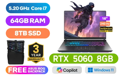 [G-SYNC] ASUS ROG Strix G16 Intel Core i7-14650HX up to 5.20GHz Processor, 30MB Cache, 16x Cores, 24x Threads / 64GB DDR5 RAM / 8TB Ultra-Fast NVMe SSD / 16" WQXGA (2560 x 1600) 240Hz Anti-Glare IPS Display / NVIDIA 50 Series GeForce RTX 5060 8GB GDDR7 Graphics Card / 1080P FHD IR Camera / Windows 11 Home (64bit) / Intel Wi-Fi 7 BE200 Wireless LAN / Bluetooth 5.4 / 3 x USB Type-A / 2x USB Type-C (Thunderbolt™ 4, DisplayPort™ / power delivery) / 1 x HDMI / 1 x Headphone and Microphone Audio Combo Jack / 1x RJ-45 / RGB Backlit Keyboard / Dolby Atmos Audio with Smart Amp Technology / FREE ASUS ROG Backpack / ASUS ROG Strix G16 G615JMR Core i7 RTX 5060 Gaming Laptop Deal[G-SYNC] ASUS ROG Strix G16 Intel Core i7-14650HX up to 5.20GHz Processor, 30MB Cache, 16x Cores, 24x Threads / 64GB DDR5 RAM / 8TB Ultra-Fast NVMe SSD / 16" WQXGA (2560 x 1600) 240Hz Anti-Glare IPS Display / NVIDIA 50 Series GeForce RTX 5060 8GB GDDR7 Graphics Card / 1080P FHD IR Camera / Windows 11 Home (64bit) / Intel Wi-Fi 7 BE200 Wireless LAN / Bluetooth 5.4 / 3 x USB Type-A / 2x USB Type-C (Thunderbolt™ 4, DisplayPort™ / power delivery) / 1 x HDMI / 1 x Headphone and Microphone Audio Combo Jack / 1x RJ-45 / RGB Backlit Keyboard / Dolby Atmos Audio with Smart Amp Technology / FREE ASUS ROG Backpack / ASUS ROG Strix G16 G615JMR Core i7 RTX 5060 Gaming Laptop Deal [G615JMR-I71610G0W/64GB/8TB] / 3 YEARS WARRANTY + FREE DELIVERY !