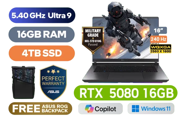 ASUS ROG Strix G16 Intel Core Ultra 9-275HX up to 5.40GHz Processor, 95MB Cache, 24x Cores, 32x Threads / 16GB DDR5 RAM / 4TB Ultra-Fast NVMe SSD / 16" WQXGA (2560 x 1600) 240Hz Anti-Glare Display / NVIDIA 50 Series GeForce RTX 5080 16GB GDDR7 Graphics Card / Windows 11 Home (64bit) / 1080P FHD IR Camera / Intel Wi-Fi 7 BE200 Wireless LAN / Bluetooth 5.4 / 3 x USB Type-A / 2x USB Type-C (Supports Thunderbolt 5 / DisplayPort / Power Delivery) / 1 x HDMI / 1 x Headphone and Microphone Audio Combo Jack / 1x RJ-45 / RGB Backlit Keyboard / 2 Speakers with Dolby Atmos Audio / FREE ASUS ROG Backpack / ASUS ROG Strix G16 G615LW Core Ultra 9 RTX 5080 Laptop DealASUS ROG Strix G16 Intel Core Ultra 9-275HX up to 5.40GHz Processor, 95MB Cache, 24x Cores, 32x Threads / 16GB DDR5 RAM / 4TB Ultra-Fast NVMe SSD / 16" WQXGA (2560 x 1600) 240Hz Anti-Glare Display / NVIDIA 50 Series GeForce RTX 5080 16GB GDDR7 Graphics Card / Windows 11 Home (64bit) / 1080P FHD IR Camera / Intel Wi-Fi 7 BE200 Wireless LAN / Bluetooth 5.4 / 3 x USB Type-A / 2x USB Type-C (Supports Thunderbolt 5 / DisplayPort / Power Delivery) / 1 x HDMI / 1 x Headphone and Microphone Audio Combo Jack / 1x RJ-45 / RGB Backlit Keyboard / 2 Speakers with Dolby Atmos Audio / FREE ASUS ROG Backpack / ASUS ROG Strix G16 G615LW Core Ultra 9 RTX 5080 Laptop Deal [G615LW-U91610G0W/4TB] / [+]Get Resident Evil: Requiem with select GeForce RTX 50 Series (Standard Edition)+ FREE DELIVERY !