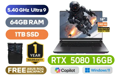 ASUS ROG Strix G16 Intel Core Ultra 9-275HX up to 5.40GHz Processor, 95MB Cache, 24x Cores, 32x Threads / 64GB DDR5 RAM / 1TB Ultra-Fast NVMe SSD / 16" WQXGA (2560 x 1600) 240Hz Anti-Glare Display / NVIDIA 50 Series GeForce RTX 5080 64GB GDDR7 Graphics Card / Windows 11 Home (64bit) / 1080P FHD IR Camera / Intel Wi-Fi 7 BE200 Wireless LAN / Bluetooth 5.4 / 3 x USB Type-A / 2x USB Type-C (Supports Thunderbolt 5 / DisplayPort / Power Delivery) / 1 x HDMI / 1 x Headphone and Microphone Audio Combo Jack / 1x RJ-45 / RGB Backlit Keyboard / 2 Speakers with Dolby Atmos Audio / FREE ASUS ROG Backpack / ASUS ROG Strix G16 G615LW Core Ultra 9 RTX 5080 Laptop DealASUS ROG Strix G16 Intel Core Ultra 9-275HX up to 5.40GHz Processor, 95MB Cache, 24x Cores, 32x Threads / 64GB DDR5 RAM / 1TB Ultra-Fast NVMe SSD / 16" WQXGA (2560 x 1600) 240Hz Anti-Glare Display / NVIDIA 50 Series GeForce RTX 5080 64GB GDDR7 Graphics Card / Windows 11 Home (64bit) / 1080P FHD IR Camera / Intel Wi-Fi 7 BE200 Wireless LAN / Bluetooth 5.4 / 3 x USB Type-A / 2x USB Type-C (Supports Thunderbolt 5 / DisplayPort / Power Delivery) / 1 x HDMI / 1 x Headphone and Microphone Audio Combo Jack / 1x RJ-45 / RGB Backlit Keyboard / 2 Speakers with Dolby Atmos Audio / FREE ASUS ROG Backpack / ASUS ROG Strix G16 G615LW Core Ultra 9 RTX 5080 Laptop Deal [G615LW-U91610G0W/64GB] / [+]Get Resident Evil Requiem with select GeForce RTX 50 Series (Standard Edition)+ FREE DELIVERY !