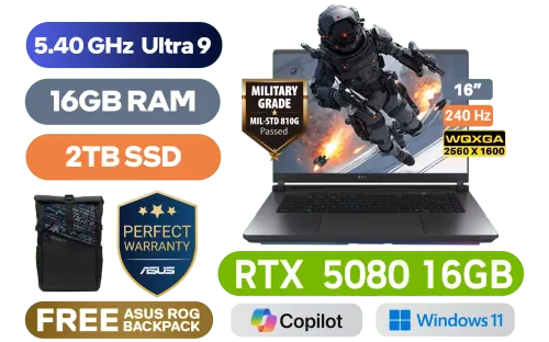 ASUS ROG Strix G16 Intel Core Ultra 9-275HX up to 5.40GHz Processor, 95MB Cache, 24x Cores, 32x Threads / 16GB DDR5 RAM / 2TB Ultra-Fast NVMe SSD / 16" WQXGA (2560 x 1600) 240Hz Anti-Glare Display / NVIDIA 50 Series GeForce RTX 5080 16GB GDDR7 Graphics Card / Windows 11 Home (64bit) / 1080P FHD IR Camera / Intel Wi-Fi 7 BE200 Wireless LAN / Bluetooth 5.4 / 3 x USB Type-A / 2x USB Type-C (Supports Thunderbolt 5 / DisplayPort / Power Delivery) / 1 x HDMI / 1 x Headphone and Microphone Audio Combo Jack / 1x RJ-45 / RGB Backlit Keyboard / 2 Speakers with Dolby Atmos Audio / FREE ASUS ROG Backpack / ASUS ROG Strix G16 G615LW Core Ultra 9 RTX 5080 Laptop DealASUS ROG Strix G16 Intel Core Ultra 9-275HX up to 5.40GHz Processor, 95MB Cache, 24x Cores, 32x Threads / 16GB DDR5 RAM / 2TB Ultra-Fast NVMe SSD / 16" WQXGA (2560 x 1600) 240Hz Anti-Glare Display / NVIDIA 50 Series GeForce RTX 5080 16GB GDDR7 Graphics Card / Windows 11 Home (64bit) / 1080P FHD IR Camera / Intel Wi-Fi 7 BE200 Wireless LAN / Bluetooth 5.4 / 3 x USB Type-A / 2x USB Type-C (Supports Thunderbolt 5 / DisplayPort / Power Delivery) / 1 x HDMI / 1 x Headphone and Microphone Audio Combo Jack / 1x RJ-45 / RGB Backlit Keyboard / 2 Speakers with Dolby Atmos Audio / FREE ASUS ROG Backpack / ASUS ROG Strix G16 G615LW Core Ultra 9 RTX 5080 Laptop Deal [G615LW-U91610G0W/2TB] / [+]Get Resident Evil: Requiem with select GeForce RTX 50 Series (Standard Edition)+ FREE DELIVERY !