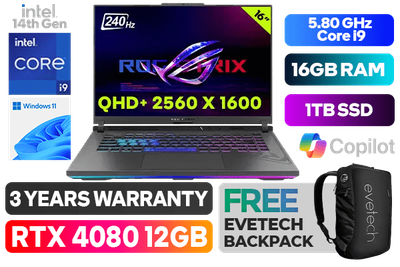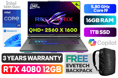 [<span style="font-size:18px; color:red;">G-SYNC</span>] ASUS ROG Strix G16 14th Gen Intel Core i9-14900HX up to 5.80GHz Processor, 36MB Cache, 24x Cores, 32x Threads / 16GB DDR5 RAM / 1TB Ultra-Fast NVMe SSD / 16" QHD+ (2560 x 1600) 3ms Response Time Anti-Glare IPS Level 240Hz Refresh Rate Display / NVIDIA 40 Series GeForce RTX 4080 12GB GDDR6 Graphics With Desktop Level Performance / Windows 11 Home (64bit) / 720P HD Web Camera / 1x Gigabit LAN (RJ45) / Intel Wi-Fi 6E Wireless LAN / Dual Bluetooth 5.3 / 2 x USB 3.2 Type-A / 1x USB 3.2 Gen 2 Type-C support DisplayPort™ / power delivery / G-SYNC / 1x Type-C Thunderbolt™ 4 support DisplayPort™ / 1 x HDMI 2.1 / 1 x Headphone and Microphone Audio Combo Jack / Per-key <span style="font-size: 20px; color: rgb(255, 0, 0);">R</span><span style="font-size: 20px; color: rgb(51, 153, 0);">G</span><span style="font-size: 20px; color: rgb(51, 102, 255);">B</span> Backlit Keyboard / 4-speaker with smart AMP technology / ASUS ROG Strix G16 Core i9 RTX 4080 Gaming Laptop Deal[G-SYNC] ASUS ROG Strix G16 14th Gen Intel Core i9-14900HX up to 5.80GHz Processor, 36MB Cache, 24x Cores, 32x Threads / 16GB DDR5 RAM / 1TB Ultra-Fast NVMe SSD / 16" QHD+ (2560 x 1600) 3ms Response Time Anti-Glare IPS Level 240Hz Refresh Rate Display / NVIDIA 40 Series GeForce RTX 4080 12GB GDDR6 Graphics With Desktop Level Performance / Windows 11 Home (64bit) / 720P HD Web Camera / 1x Gigabit LAN (RJ45) / Intel Wi-Fi 6E Wireless LAN / Dual Bluetooth 5.3 / 2 x USB 3.2 Type-A / 1x USB 3.2 Gen 2 Type-C support DisplayPort™ / power delivery / G-SYNC / 1x Type-C Thunderbolt™ 4 support DisplayPort™ / 1 x HDMI 2.1 / 1 x Headphone and Microphone Audio Combo Jack / Per-key RGB Backlit Keyboard / 4-speaker with smart AMP technology / ASUS ROG Strix G16 Core i9 RTX 4080 Gaming Laptop Deal [G614JZR-I91610G1W] / 3 YEARS WARRANTY / [+] GET FREE EVETECH NEO Premium Gaming Backpack+ FREE DELIVERY !