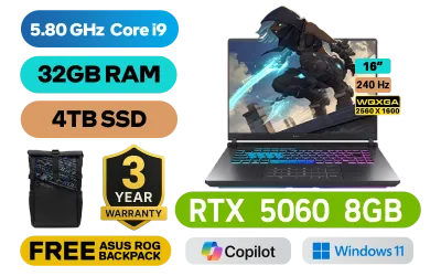 [G-SYNC] ASUS ROG Strix G16 Intel Core i9-14900HX up to 5.80GHz Processor, 36MB Cache, 24x Cores, 32x Threads / 32GB DDR5 RAM / 4TB Ultra-Fast NVMe SSD / 16" WQXGA (2560 x 1600) 240Hz Anti-Glare Display / NVIDIA 50 Series GeForce RTX 5060 8GB GDDR7 Graphics Card / 1080P FHD IR Camera / Windows 11 Home (64bit) / Intel Wi-Fi 7 BE200 Wireless LAN / Bluetooth 5.4 / 3 x USB Type-A / 2x USB Type-C (Thunderbolt™ 4, DisplayPort™ / power delivery) / 1 x HDMI / 1 x Headphone and Microphone Audio Combo Jack / 1x RJ-45 / Per-Key RGB Backlit Keyboard / Dolby Atmos Audio with Smart Amp Technology / FREE ASUS ROG Backpack / ASUS ROG Strix G16 G615JMR Core i9 RTX 5060 Gaming Laptop Deal[G-SYNC] ASUS ROG Strix G16 Intel Core i9-14900HX up to 5.80GHz Processor, 36MB Cache, 24x Cores, 32x Threads / 32GB DDR5 RAM / 4TB Ultra-Fast NVMe SSD / 16" WQXGA (2560 x 1600) 240Hz Anti-Glare Display / NVIDIA 50 Series GeForce RTX 5060 8GB GDDR7 Graphics Card / 1080P FHD IR Camera / Windows 11 Home (64bit) / Intel Wi-Fi 7 BE200 Wireless LAN / Bluetooth 5.4 / 3 x USB Type-A / 2x USB Type-C (Thunderbolt™ 4, DisplayPort™ / power delivery) / 1 x HDMI / 1 x Headphone and Microphone Audio Combo Jack / 1x RJ-45 / Per-Key RGB Backlit Keyboard / Dolby Atmos Audio with Smart Amp Technology / FREE ASUS ROG Backpack / ASUS ROG Strix G16 G615JMR Core i9 RTX 5060 Gaming Laptop Deal [G615JMR-I93210G0W/4TB] / 3 YEARS WARRANTY + FREE DELIVERY !