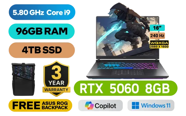 [G-SYNC] ASUS ROG Strix G16 Intel Core i9-14900HX up to 5.80GHz Processor, 36MB Cache, 24x Cores, 32x Threads / 96GB DDR5 RAM / 4TB Ultra-Fast NVMe SSD / 16" WQXGA (2560 x 1600) 240Hz Anti-Glare Display / NVIDIA 50 Series GeForce RTX 5060 8GB GDDR7 Graphics Card / 1080P FHD IR Camera / Windows 11 Home (64bit) / Intel Wi-Fi 7 BE200 Wireless LAN / Bluetooth 5.4 / 3 x USB Type-A / 2x USB Type-C (Thunderbolt™ 4, DisplayPort™ / power delivery) / 1 x HDMI / 1 x Headphone and Microphone Audio Combo Jack / 1x RJ-45 / Per-Key RGB Backlit Keyboard / Dolby Atmos Audio with Smart Amp Technology / FREE ASUS ROG Backpack / ASUS ROG Strix G16 G615JMR Core i9 RTX 5060 Gaming Laptop Deal[G-SYNC] ASUS ROG Strix G16 Intel Core i9-14900HX up to 5.80GHz Processor, 36MB Cache, 24x Cores, 32x Threads / 96GB DDR5 RAM / 4TB Ultra-Fast NVMe SSD / 16" WQXGA (2560 x 1600) 240Hz Anti-Glare Display / NVIDIA 50 Series GeForce RTX 5060 8GB GDDR7 Graphics Card / 1080P FHD IR Camera / Windows 11 Home (64bit) / Intel Wi-Fi 7 BE200 Wireless LAN / Bluetooth 5.4 / 3 x USB Type-A / 2x USB Type-C (Thunderbolt™ 4, DisplayPort™ / power delivery) / 1 x HDMI / 1 x Headphone and Microphone Audio Combo Jack / 1x RJ-45 / Per-Key RGB Backlit Keyboard / Dolby Atmos Audio with Smart Amp Technology / FREE ASUS ROG Backpack / ASUS ROG Strix G16 G615JMR Core i9 RTX 5060 Gaming Laptop Deal [G615JMR-I93210G0W/96GB/4TB] / 3 YEARS WARRANTY + FREE DELIVERY !