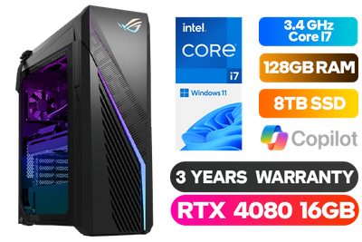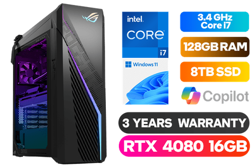 </span> / ASUS ROG Strix G16CH Core i7 RTX 4080 Gaming Desktop PCASUS ROG Strix G16CH Desktop PC Intel 13th gen Core i7-13700KF up to 3.4GHz Processor, 30MB Cache, 16 cores, 28 Threads / 128GB DDR4 RAM / 8TB Ultra-Fast NVME SSD / NVIDIA 40 Series GeForce RTX 4080 16GB Dedicated Graphics / Windows 11 Home(64bit) / Intel Wi-Fi 6 AX201 Wireless LAN / Bluetooth 5.2 / 850W power supply / 2x USB Type-A / 2x USB Type-C / 1x Headphone, 1x Microphone / 1x GbE LAN Port / 3x Display-Port / 2x HDMI / 1x keyboard Black Red / [+] EXTRA MOUSE, Wi-Fi Antenna, ASUS KEYBOARD