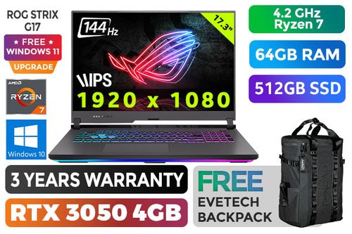 ASUS ROG Strix G17 G713IC AMD Ryzen 7 4800H up to 4.2GHz Processor with AMD Max Boost Clock Technology, 12MB Cache, 8x Cores, 16x Threads / 64GB DDR4 RAM / 512GB Ultra-Fast NVMe SSD / 17.3" FHD 1920x1080 Anti-Glare 144Hz, IPS Level Thin-Bezel Display / NVIDIA GeForce RTX 3050 4GB GDDR6 Dedicated Graphics / Windows 10 Home (64bit) / Chiclet <span style="font-size: 20px; color: rgb(255, 0, 0);">R</span><span style="font-size: 20px; color: rgb(51, 153, 0);">G</span><span style="font-size: 20px; color: rgb(51, 102, 255);">B</span> 4-Zone Backlit Keyboard / Bluetooth v5.1 / 802.11 ax Wi-Fi 6 Wireless LAN / No Web Camera / 1 x Gigabit Lan Port (RJ45) / 3 x USB 3.2 Type-A / 1x Type C USB 3.2 Gen 2 with Power Delivery, Display Port and G-Sync / 1 x HDMI / 1x Microphone and Headphone Combo jack / 2 x 4W speaker with smart AMP technology / ASUS ROG Strix G17 G713IC RTX 3050 Ryzen 7 Gaming Laptop DealASUS ROG Strix G17 G713IC AMD Ryzen 7 4800H up to 4.2GHz Processor with AMD Max Boost Clock Technology, 12MB Cache, 8x Cores, 16x Threads / 64GB DDR4 RAM / 512GB Ultra-Fast NVMe SSD / 17.3" FHD 1920x1080 Anti-Glare 144Hz, IPS Level Thin-Bezel Display / NVIDIA GeForce RTX 3050 4GB GDDR6 Dedicated Graphics / Windows 10 Home (64bit) / Chiclet RGB 4-Zone Backlit Keyboard / Bluetooth v5.1 / 802.11 ax Wi-Fi 6 Wireless LAN / No Web Camera / 1 x Gigabit Lan Port (RJ45) / 3 x USB 3.2 Type-A / 1x Type C USB 3.2 Gen 2 with Power Delivery, Display Port and G-Sync / 1 x HDMI / 1x Microphone and Headphone Combo jack / 2 x 4W speaker with smart AMP technology / ASUS ROG Strix G17 G713IC RTX 3050 Ryzen 7 Gaming Laptop Deal [G713IC-78512G0T/64GB] / 3 YEARS WARRANTY + FREE DELIVERY !