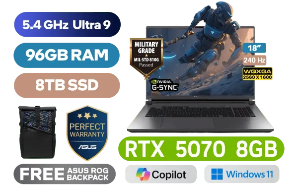 [G-SYNC] ASUS ROG STRIX G18 G815LP Intel® Core™ Ultra 9-275HX up to 5.4GHz Processor, 76MB Cache, 24x Cores, 24x Threads / 96GB DDR5 RAM / 8TB Ultra-Fast PCIe NVMe SSD / 18" WQXGA (2560x1600) 240Hz IPS-Level Display / NVIDIA 50 Series GeForce RTX 5070 8GB GDDR7 Graphics Card / Windows 11 Home (64bit) / 1080P FHD IR Camera / Tri-Band Wi-Fi 7 Wireless LAN / Dual Bluetooth 5.4 / 3x USB Type-A / 2x USB Type-C (Support Thunderbolt™ 4 / DisplayPort / Power Delivery) / 1 x HDMI / 1 x Headphone & Microphone Combo Jack / 1x RJ45 / RGB Backlit Keyboard / 2 speakers with Dolby Atmos / Free ASUS ROG Backpack / ASUS ROG STRIX G18 G815LP Ultra 9 RTX 5070 Laptop Deal[G-SYNC] ASUS ROG STRIX G18 G815LP Intel® Core™ Ultra 9-275HX up to 5.4GHz Processor, 76MB Cache, 24x Cores, 24x Threads / 96GB DDR5 RAM / 8TB Ultra-Fast PCIe NVMe SSD / 18" WQXGA (2560x1600) 240Hz IPS-Level Display / NVIDIA 50 Series GeForce RTX 5070 8GB GDDR7 Graphics Card / Windows 11 Home (64bit) / 1080P FHD IR Camera / Tri-Band Wi-Fi 7 Wireless LAN / Dual Bluetooth 5.4 / 3x USB Type-A / 2x USB Type-C (Support Thunderbolt™ 4 / DisplayPort / Power Delivery) / 1 x HDMI / 1 x Headphone & Microphone Combo Jack / 1x RJ45 / RGB Backlit Keyboard / 2 speakers with Dolby Atmos / Free ASUS ROG Backpack / ASUS ROG STRIX G18 G815LP Ultra 9 RTX 5070 Laptop Deal [G815LP-U93210G0W/96GB/8TB] / [+]Get Resident Evil: Requiem with select GeForce RTX 50 Series (Standard Edition) / 3 YEARS WARRANTY + FREE DELIVERY !