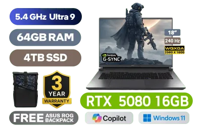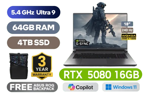 [G-SYNC] ASUS ROG STRIX G18 G815LW Intel® Core™ Ultra 9-275HX up to 5.4GHz Processor, 76MB Cache, 24x Cores, 24x Threads / 64GB DDR5 RAM / 4TB Ultra-Fast PCIe NVMe SSD / 18" WQXGA (2560x1600) 240Hz IPS-Level Display / NVIDIA 50 Series GeForce RTX 5080 16GB GDDR7 Graphics Card / Windows 11 Home (64bit) / 1080P FHD IR Camera / Intel WiFi 7 BE200 Wireless LAN / Bluetooth 5.4 / 3x USB Type-A / 2x USB Type-C (Support Thunderbolt 4 / DisplayPort / Power Delivery) / 1 x HDMI / 1 x Headphone & Microphone Combo Jack / 1x RJ45 / RGB Backlit Keyboard / 2 speakers with Dolby Atmos / Free ASUS ROG Backpack / ASUS ROG STRIX G18 G815LW Ultra 9 RTX 5080 Laptop Deal[G-SYNC] ASUS ROG STRIX G18 G815LW Intel® Core™ Ultra 9-275HX up to 5.4GHz Processor, 76MB Cache, 24x Cores, 24x Threads / 64GB DDR5 RAM / 4TB Ultra-Fast PCIe NVMe SSD / 18" WQXGA (2560x1600) 240Hz IPS-Level Display / NVIDIA 50 Series GeForce RTX 5080 16GB GDDR7 Graphics Card / Windows 11 Home (64bit) / 1080P FHD IR Camera / Intel WiFi 7 BE200 Wireless LAN / Bluetooth 5.4 / 3x USB Type-A / 2x USB Type-C (Support Thunderbolt 4 / DisplayPort / Power Delivery) / 1 x HDMI / 1 x Headphone & Microphone Combo Jack / 1x RJ45 / RGB Backlit Keyboard / 2 speakers with Dolby Atmos / Free ASUS ROG Backpack / ASUS ROG STRIX G18 G815LW Ultra 9 RTX 5080 Laptop Deal [G815LW-U93210G0W/64GB/4TB] / 3 YEARS WARRANTY / [+]Get Resident Evil Requiem with select GeForce RTX 50 Series (Standard Edition)+ FREE DELIVERY !