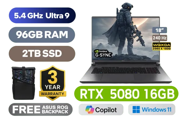 [G-SYNC] ASUS ROG STRIX G18 G815LW Intel® Core™ Ultra 9-275HX up to 5.4GHz Processor, 76MB Cache, 24x Cores, 24x Threads / 96GB DDR5 RAM / 2TB Ultra-Fast PCIe NVMe SSD / 18" WQXGA (2560x1600) 240Hz IPS-Level Display / NVIDIA 50 Series GeForce RTX 5080 16GB GDDR7 Graphics Card / Windows 11 Home (64bit) / 1080P FHD IR Camera / Intel WiFi 7 BE200 Wireless LAN / Bluetooth 5.4 / 3x USB Type-A / 2x USB Type-C (Support Thunderbolt 4 / DisplayPort / Power Delivery) / 1 x HDMI / 1 x Headphone & Microphone Combo Jack / 1x RJ45 / RGB Backlit Keyboard / 2 speakers with Dolby Atmos / Free ASUS ROG Backpack / ASUS ROG STRIX G18 G815LW Ultra 9 RTX 5080 Laptop Deal[G-SYNC] ASUS ROG STRIX G18 G815LW Intel® Core™ Ultra 9-275HX up to 5.4GHz Processor, 76MB Cache, 24x Cores, 24x Threads / 96GB DDR5 RAM / 2TB Ultra-Fast PCIe NVMe SSD / 18" WQXGA (2560x1600) 240Hz IPS-Level Display / NVIDIA 50 Series GeForce RTX 5080 16GB GDDR7 Graphics Card / Windows 11 Home (64bit) / 1080P FHD IR Camera / Intel WiFi 7 BE200 Wireless LAN / Bluetooth 5.4 / 3x USB Type-A / 2x USB Type-C (Support Thunderbolt 4 / DisplayPort / Power Delivery) / 1 x HDMI / 1 x Headphone & Microphone Combo Jack / 1x RJ45 / RGB Backlit Keyboard / 2 speakers with Dolby Atmos / Free ASUS ROG Backpack / ASUS ROG STRIX G18 G815LW Ultra 9 RTX 5080 Laptop Deal [G815LW-U93210G0W/96GB/2TB] / 3 YEARS WARRANTY / [+]Get Resident Evil Requiem with select GeForce RTX 50 Series (Standard Edition)+ FREE DELIVERY !