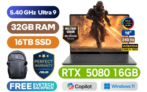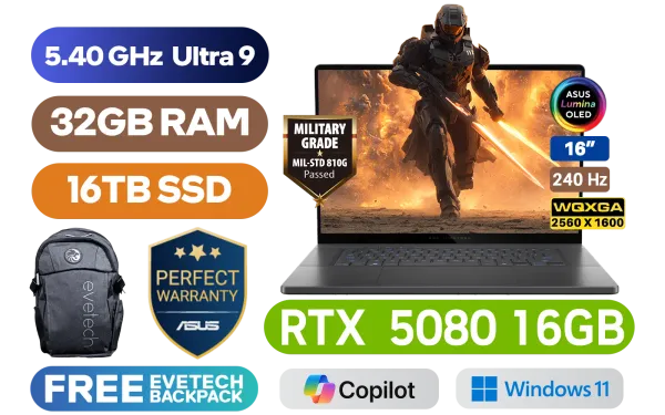 ASUS ROG Zephyrus G16 GU605CW Intel Core™ Ultra 9-285H up to 5.40GHz Processor, 24MB Cache, 16x Cores, 16x Threads / 32GB LPDDR5X RAM / 16TB Ultra-Fast NVMe SSD / 16" WQXGA (2560 x 1600) 240Hz OLED Display / NVIDIA 50 Series GeForce RTX 5080 16GB GDDR7 Graphics With Desktop Level Performance / Windows 11 Home (64bit) / 1080P FHD IR Camera / Wi-Fi 7 BE201 Wireless LAN / Bluetooth 5.4 / 2x USB 3.2 Type-A / 1x USB 3.2 Gen 2 Type-C (support DisplayPort and Power Delivery) / 1x Thunderbolt™ 4 with (Support for DisplayPort™ / Power Delivery) / 1x HDMI 2.1 FRL / 1x Audio And Microphone Combo Jack / 1x SD Card Reader / RGB Backlit Chicklet Keyboard / 4x Speaker System with Smart Amplifier Technology / ASUS ROG Zephyrus G16 GU605CW RTX 5080 Gaming Laptop DealASUS ROG Zephyrus G16 GU605CW Intel Core™ Ultra 9-285H up to 5.40GHz Processor, 24MB Cache, 16x Cores, 16x Threads / 32GB LPDDR5X RAM / 16TB Ultra-Fast NVMe SSD / 16" WQXGA (2560 x 1600) 240Hz OLED Display / NVIDIA 50 Series GeForce RTX 5080 16GB GDDR7 Graphics With Desktop Level Performance / Windows 11 Home (64bit) / 1080P FHD IR Camera / Wi-Fi 7 BE201 Wireless LAN / Bluetooth 5.4 / 2x USB 3.2 Type-A / 1x USB 3.2 Gen 2 Type-C (support DisplayPort and Power Delivery) / 1x Thunderbolt™ 4 with (Support for DisplayPort™ / Power Delivery) / 1x HDMI 2.1 FRL / 1x Audio And Microphone Combo Jack / 1x SD Card Reader / RGB Backlit Chicklet Keyboard / 4x Speaker System with Smart Amplifier Technology / ASUS ROG Zephyrus G16 GU605CW RTX 5080 Gaming Laptop Deal [GU605CW-OU93220G0W/16TB] / 3 YEARS WARRANTY / [+] GET FREE EVETECH FLUX Premium Gaming Backpack / [+]Get Resident Evil: Requiem with select GeForce RTX 50 Series (Standard Edition)+ FREE DELIVERY !