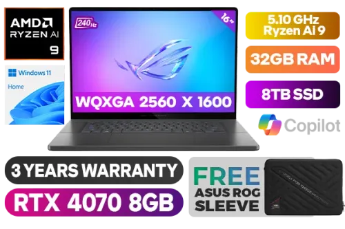 ASUS ROG Zephyrus G16 GA605WI AMD Ryzen AI 9 HX 370 up to 5.10GHz Processor, 36MB Cache, 12x Cores, 24x Threads / 32GB LPDDR5X RAM / 8TB Ultra-Fast NVMe SSD / 16" WQXGA (2560 x 1600) 240Hz Glossy OLED Display / NVIDIA 40 Series GeForce RTX 4070 8GB GDDR6 Dedicated Graphics Card / Windows 11 Home (64bit) / 1080p FHD IR Web Camera / MediaTek Wi-Fi 7 Wireless LAN / Bluetooth v5.4 / 2x USB Type-A / 2x USB Type-C / 1x HDMI 2.1 / 1x Audio And Microphone Combo Jack / 1x Micro SD Card Reader / RGB Backlit chicklet keyboard / 4 x 2W speakers with Smart AMP technology / FREE Asus ROG Sleeve / ASUS ROG Zephyrus G16 RTX 4070 Gaming LaptopASUS ROG Zephyrus G16 GA605WI AMD Ryzen AI 9 HX 370 up to 5.10GHz Processor, 36MB Cache, 12x Cores, 24x Threads / 32GB LPDDR5X RAM / 8TB Ultra-Fast NVMe SSD / 16" WQXGA (2560 x 1600) 240Hz Glossy OLED Display / NVIDIA 40 Series GeForce RTX 4070 8GB GDDR6 Dedicated Graphics Card / Windows 11 Home (64bit) / 1080p FHD IR Web Camera / MediaTek Wi-Fi 7 Wireless LAN / Bluetooth v5.4 / 2x USB Type-A / 2x USB Type-C / 1x HDMI 2.1 / 1x Audio And Microphone Combo Jack / 1x Micro SD Card Reader / RGB Backlit chicklet keyboard / 4 x 2W speakers with Smart AMP technology / FREE Asus ROG Sleeve / ASUS ROG Zephyrus G16 RTX 4070 Gaming Laptop [GA605WI-O93210G0W/8TB] / 3 YEARS WARRANTY / [+] GET FREE EVETECH NEO Premium Gaming Backpack+ FREE DELIVERY !