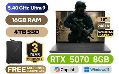 ASUS ROG Zephyrus G16 GU605CP AMD Intel® Core™ Ultra 9-285H up to 5.40GHz Processor, 24MB Cache, 16x Cores, 16x Threads / 16GB LPDDR5X RAM / 4TB Ultra-Fast NVMe SSD / 16" 2.5K (2560 x 1600) 240Hz OLED Display / NVIDIA 50 Series GeForce RTX 5070 8GB GDDR7 Dedicated Graphics Card / Windows 11 Home (64bit) / 1080P FHD IR Camera / Wi-Fi 7 BE201 Wireless LAN / Bluetooth 5.4 / 2x USB Type-A / 2x USB Type-C / 1x HDMI 2.1 / 1x Audio And Microphone Combo Jack / 1x SD Card Reader / White Backlit chicklet keyboard / Dolby Atmos Audio with AI noise-canceling technology / ASUS ROG Zephyrus G16 Ultra 9 RTX 5070 Gaming LaptopASUS ROG Zephyrus G16 GU605CP AMD Intel® Core™ Ultra 9-285H up to 5.40GHz Processor, 24MB Cache, 16x Cores, 16x Threads / 16GB LPDDR5X RAM / 4TB Ultra-Fast NVMe SSD / 16" 2.5K (2560 x 1600) 240Hz OLED Display / NVIDIA 50 Series GeForce RTX 5070 8GB GDDR7 Dedicated Graphics Card / Windows 11 Home (64bit) / 1080P FHD IR Camera / Wi-Fi 7 BE201 Wireless LAN / Bluetooth 5.4 / 2x USB Type-A / 2x USB Type-C / 1x HDMI 2.1 / 1x Audio And Microphone Combo Jack / 1x SD Card Reader / White Backlit chicklet keyboard / Dolby Atmos Audio with AI noise-canceling technology / ASUS ROG Zephyrus G16 Ultra 9 RTX 5070 Gaming Laptop [GU605CP-OU91610G0W/4TB] / 3 YEARS WARRANTY / [+]Get Resident Evil Requiem with select GeForce RTX 50 Series (Standard Edition)+ FREE DELIVERY !