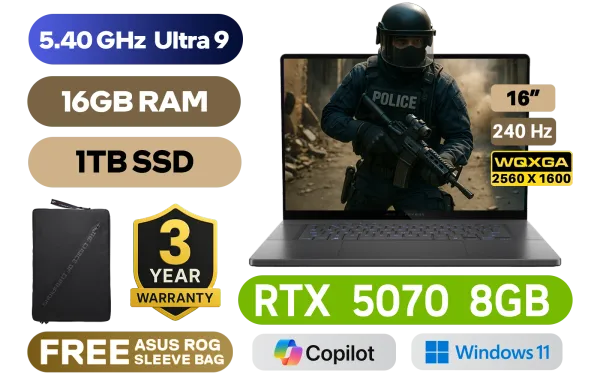 ASUS ROG Zephyrus G16 GU605CP AMD Intel® Core™ Ultra 9-285H up to 5.40GHz Processor, 24MB Cache, 16x Cores, 16x Threads / 16GB LPDDR5X RAM / 1TB Ultra-Fast NVMe SSD / 16" 2.5K (2560 x 1600) 240Hz OLED Display / NVIDIA 50 Series GeForce RTX 5070 8GB GDDR7 Dedicated Graphics Card / Windows 11 Home (64bit) / 1080P FHD IR Camera / Wi-Fi 7 BE201 Wireless LAN / Bluetooth 5.4 / 2x USB Type-A / 2x USB Type-C / 1x HDMI 2.1 / 1x Audio And Microphone Combo Jack / 1x SD Card Reader / White Backlit chicklet keyboard / Dolby Atmos Audio with AI noise-canceling technology / ASUS ROG Zephyrus G16 Ultra 9 RTX 5070 Gaming LaptopASUS ROG Zephyrus G16 GU605CP AMD Intel® Core™ Ultra 9-285H up to 5.40GHz Processor, 24MB Cache, 16x Cores, 16x Threads / 16GB LPDDR5X RAM / 1TB Ultra-Fast NVMe SSD / 16" 2.5K (2560 x 1600) 240Hz OLED Display / NVIDIA 50 Series GeForce RTX 5070 8GB GDDR7 Dedicated Graphics Card / Windows 11 Home (64bit) / 1080P FHD IR Camera / Wi-Fi 7 BE201 Wireless LAN / Bluetooth 5.4 / 2x USB Type-A / 2x USB Type-C / 1x HDMI 2.1 / 1x Audio And Microphone Combo Jack / 1x SD Card Reader / White Backlit chicklet keyboard / Dolby Atmos Audio with AI noise-canceling technology / ASUS ROG Zephyrus G16 Ultra 9 RTX 5070 Gaming Laptop [GU605CP-OU91610G0W] / 3 YEARS WARRANTY / [+]Get Resident Evil Requiem with select GeForce RTX 50 Series (Standard Edition)+ FREE DELIVERY !