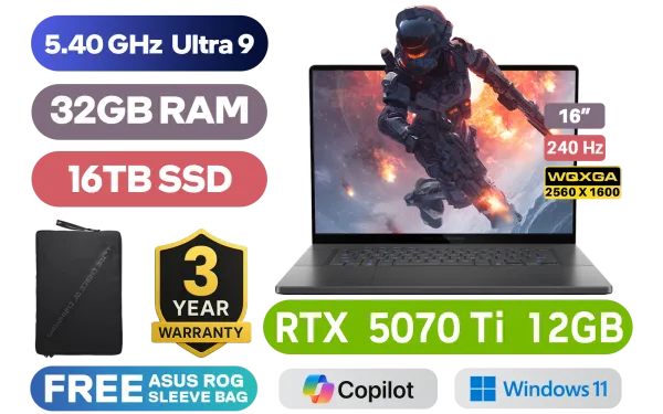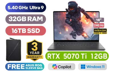 ASUS ROG Zephyrus G16 GU605CR Intel® Core™ Ultra 9-285H up to 5.40GHz Processor, 24MB Cache, 16x Cores, 16x Threads / 32GB LPDDR5X RAM / 16TB Ultra-Fast NVMe SSD / 16" WQXGA (2560 x 1600) 240Hz, OLED Display / NVIDIA 50 Series GeForce RTX 5070 Ti 12GB GDDR7 Dedicated Graphics Card / <span style="font-size: 20px; color: #00BFFF; font-weight: bold;">Windows 11 Professional (64bit)</span> / Wi-Fi 7 BE201 Wireless LAN / Bluetooth 5.4 / 1080P FHD IR Camera / 2x USB Type-A / 2x USB Type-C (Thunderbolt 4 / DisplayPort™ / Power Delivery) / 1x HDMI / 1x Headphone & Microphone Combo Jack / 1x SD Card Reader / RGB Backlit Chicklet Keyboard / Dolby Atmos Audio with AI noise-canceling technology / ASUS ROG Zephyrus G16 Ultra 9 RTX 5070 Ti Gaming LaptopASUS ROG Zephyrus G16 GU605CR Intel® Core™ Ultra 9-285H up to 5.40GHz Processor, 24MB Cache, 16x Cores, 16x Threads / 32GB LPDDR5X RAM / 16TB Ultra-Fast NVMe SSD / 16" WQXGA (2560 x 1600) 240Hz, OLED Display / NVIDIA 50 Series GeForce RTX 5070 Ti 12GB GDDR7 Dedicated Graphics Card / Windows 11 Professional (64bit) / Wi-Fi 7 BE201 Wireless LAN / Bluetooth 5.4 / 1080P FHD IR Camera / 2x USB Type-A / 2x USB Type-C (Thunderbolt 4 / DisplayPort™ / Power Delivery) / 1x HDMI / 1x Headphone & Microphone Combo Jack / 1x SD Card Reader / RGB Backlit Chicklet Keyboard / Dolby Atmos Audio with AI noise-canceling technology / ASUS ROG Zephyrus G16 Ultra 9 RTX 5070 Ti Gaming Laptop [GU605CR-OU93220G0X/16TB] / 3 YEARS WARRANTY / [+]Get Resident Evil Requiem with select GeForce RTX 50 Series (Standard Edition)+ FREE DELIVERY !