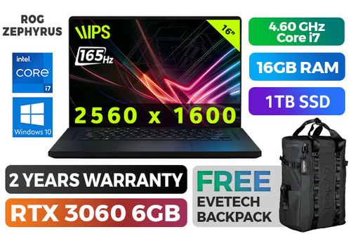 ASUS ROG Zephyrus M16 GU603HM 11th Gen Intel Core i7-11800H up to 4.60GHz Processor, 24MB Cache, 8x Cores, 16x Threads / 16GB DDR4 RAM / 1TB Ultra-Fast NVMe SSD / 16" WQXGA (2560 x 1600) 165Hz IPS Level Display / NVIDIA 30 Series GeForce RTX 3060 6GB GDDR6 Dedicated Graphics / Windows 10 Home (64bit) / HD Web Camera / Wi-Fi 6 MT7921 Wireless LAN / Bluetooth v5.2 / 2 x USB 3.2 Type-A / 1x USB 3.2 Gen 2 Type-C support DisplayPort / 1x Thunderbolt 4 support DisplayPort / 1 x HDMI 2.0b / 1 x Audio And Microphone Combo Jack / 1x card reader (microSD) / Fingerprint Reader / RGB Backlit chicklet keyboard / 2 x 2W speakers with Smart AMP technology / 2 YEAR WARRANTY / ASUS ROG Zephyrus M16 GU603HM Core i7 RTX 3060 Gaming LaptopASUS ROG Zephyrus M16 GU603HM 11th Gen Intel Core i7-11800H up to 4.60GHz Processor, 24MB Cache, 8x Cores, 16x Threads / 16GB DDR4 RAM / 1TB Ultra-Fast NVMe SSD / 16" WQXGA (2560 x 1600) 165Hz IPS Level Display / NVIDIA 30 Series GeForce RTX 3060 6GB GDDR6 Dedicated Graphics / Windows 10 Home (64bit) / HD Web Camera / Wi-Fi 6 MT7921 Wireless LAN / Bluetooth v5.2 / 2 x USB 3.2 Type-A / 1x USB 3.2 Gen 2 Type-C support DisplayPort / 1x Thunderbolt 4 support DisplayPort / 1 x HDMI 2.0b / 1 x Audio And Microphone Combo Jack / 1x card reader (microSD) / Fingerprint Reader / RGB Backlit chicklet keyboard / 2 x 2W speakers with Smart AMP technology / 2 YEAR WARRANTY / ASUS ROG Zephyrus M16 GU603HM Core i7 RTX 3060 Gaming Laptop [GU603HM-I71610B0T] + FREE DELIVERY !
