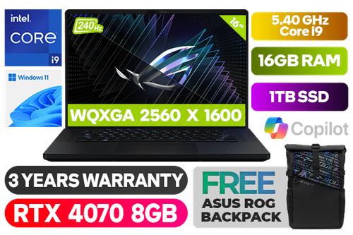 ASUS ROG Zephyrus M16 13th Gen Intel Core i9-13900H up to 5.40GHz Processor, 24MB Cache, 14x Cores, 20x Threads / 16GB DDR5 RAM / 1TB Ultra-Fast NVMe SSD / 16" WQXGA (2560 x 1600) 240Hz IPS Level Display / NVIDIA 40 Series GeForce RTX 4070 8GB GDDR6 Graphics With Desktop Level Performance / Windows 11 Home (64bit) / FHD Web Camera / Wi-Fi 6E Wireless LAN / Bluetooth v5.2 / 2 x USB 3.2 Type-A / 1x USB 3.2 Gen 2 Type-C support DisplayPort / 1x USB Type-C Thunderbolt 4 support DisplayPort / 1 x HDMI 2.0b / 1 x Audio And Microphone Combo Jack / 1 x Micro SD Card Reader / RGB Backlit keyboard / 2 x 2W speakers with Smart AMP technology / FREE ASUS ROG Backpack / ASUS ROG Zephyrus M16 GU604VI RTX 4070 Gaming Laptop DealASUS ROG Zephyrus M16 13th Gen Intel Core i9-13900H up to 5.40GHz Processor, 24MB Cache, 14x Cores, 20x Threads / 16GB DDR5 RAM / 1TB Ultra-Fast NVMe SSD / 16" WQXGA (2560 x 1600) 240Hz IPS Level Display / NVIDIA 40 Series GeForce RTX 4070 8GB GDDR6 Graphics With Desktop Level Performance / Windows 11 Home (64bit) / FHD Web Camera / Wi-Fi 6E Wireless LAN / Bluetooth v5.2 / 2 x USB 3.2 Type-A / 1x USB 3.2 Gen 2 Type-C support DisplayPort / 1x USB Type-C Thunderbolt 4 support DisplayPort / 1 x HDMI 2.0b / 1 x Audio And Microphone Combo Jack / 1 x Micro SD Card Reader / RGB Backlit keyboard / 2 x 2W speakers with Smart AMP technology / FREE ASUS ROG Backpack / ASUS ROG Zephyrus M16 GU604VI RTX 4070 Gaming Laptop Deal [GU604VI-I91610B1W] / 3 YEARS WARRANTY + FREE DELIVERY !