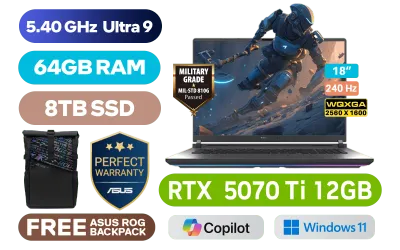 ASUS ROG Strix G18 Intel® Core™ Ultra 9 275HX up to 5.40GHz Processor, 76MB Cache, 24x Cores, 24x Threads / 64GB DDR5 RAM / 8TB Ultra-Fast PCIe NVMe SSD / 18" WQXGA (2560 x 1600) 240Hz, IPS-level Display / NVIDIA GeForce RTX 5070 Ti 12GB GDDR7 Dedicated Graphics / Windows 11 Home (64bit) / 1080P FHD IR Camera / Intel Wi-Fi 7 802.11be Wireless LAN / Bluetooth 5.4 / 3x USB Type-A / 2x USB Type-C (Thunderbolt™ 5 / DisplayPort™ / Power Delivery) / 1x HDMI / 1x Headphone and Microphone Combo Jack / 1x RJ45 / RGB Backlit Keyboard / 2 speaker system with Dolby Atmos Audio / FREE ASUS ROG Backpack / ASUS ROG Strix G18 Intel® Core™ Ultra 9 RTX 5070 Ti Gaming Laptop DealASUS ROG Strix G18 Intel® Core™ Ultra 9 275HX up to 5.40GHz Processor, 76MB Cache, 24x Cores, 24x Threads / 64GB DDR5 RAM / 8TB Ultra-Fast PCIe NVMe SSD / 18" WQXGA (2560 x 1600) 240Hz, IPS-level Display / NVIDIA GeForce RTX 5070 Ti 12GB GDDR7 Dedicated Graphics / Windows 11 Home (64bit) / 1080P FHD IR Camera / Intel Wi-Fi 7 802.11be Wireless LAN / Bluetooth 5.4 / 3x USB Type-A / 2x USB Type-C (Thunderbolt™ 5 / DisplayPort™ / Power Delivery) / 1x HDMI / 1x Headphone and Microphone Combo Jack / 1x RJ45 / RGB Backlit Keyboard / 2 speaker system with Dolby Atmos Audio / FREE ASUS ROG Backpack / ASUS ROG Strix G18 Intel® Core™ Ultra 9 RTX 5070 Ti Gaming Laptop Deal [G815LR-U93210G0W/64GB/8TB] / 3 YEARS WARRANTY / [+]Get Resident Evil: Requiem with select GeForce RTX 50 Series (Standard Edition)+ FREE DELIVERY !