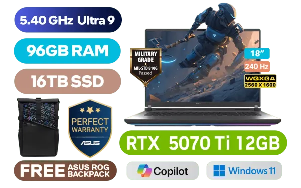 ASUS ROG Strix G18 Intel® Core™ Ultra 9 275HX up to 5.40GHz Processor, 76MB Cache, 24x Cores, 24x Threads / 96GB DDR5 RAM / 16TB Ultra-Fast PCIe NVMe SSD / 18" WQXGA (2560 x 1600) 240Hz, IPS-level Display / NVIDIA GeForce RTX 5070 Ti 12GB GDDR7 Dedicated Graphics / Windows 11 Home (64bit) / 1080P FHD IR Camera / Intel Wi-Fi 7 802.11be Wireless LAN / Bluetooth 5.4 / 3x USB Type-A / 2x USB Type-C (Thunderbolt™ 5 / DisplayPort™ / Power Delivery) / 1x HDMI / 1x Headphone and Microphone Combo Jack / 1x RJ45 / RGB Backlit Keyboard / 2 speaker system with Dolby Atmos Audio / FREE ASUS ROG Backpack / ASUS ROG Strix G18 Intel® Core™ Ultra 9 RTX 5070 Ti Gaming Laptop DealASUS ROG Strix G18 Intel® Core™ Ultra 9 275HX up to 5.40GHz Processor, 76MB Cache, 24x Cores, 24x Threads / 96GB DDR5 RAM / 16TB Ultra-Fast PCIe NVMe SSD / 18" WQXGA (2560 x 1600) 240Hz, IPS-level Display / NVIDIA GeForce RTX 5070 Ti 12GB GDDR7 Dedicated Graphics / Windows 11 Home (64bit) / 1080P FHD IR Camera / Intel Wi-Fi 7 802.11be Wireless LAN / Bluetooth 5.4 / 3x USB Type-A / 2x USB Type-C (Thunderbolt™ 5 / DisplayPort™ / Power Delivery) / 1x HDMI / 1x Headphone and Microphone Combo Jack / 1x RJ45 / RGB Backlit Keyboard / 2 speaker system with Dolby Atmos Audio / FREE ASUS ROG Backpack / ASUS ROG Strix G18 Intel® Core™ Ultra 9 RTX 5070 Ti Gaming Laptop Deal [G815LR-U93210G0W/96GB/16TB ] / 3 YEARS WARRANTY / [+]Get Resident Evil: Requiem with select GeForce RTX 50 Series (Standard Edition)+ FREE DELIVERY !