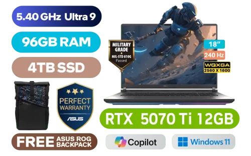 ASUS ROG Strix G18 Intel® Core™ Ultra 9 275HX up to 5.40GHz Processor, 76MB Cache, 24x Cores, 24x Threads / 96GB DDR5 RAM / 4TB Ultra-Fast PCIe NVMe SSD / 18" WQXGA (2560 x 1600) 240Hz, IPS-level Display / NVIDIA GeForce RTX 5070 Ti 12GB GDDR7 Dedicated Graphics / Windows 11 Home (64bit) / 1080P FHD IR Camera / Intel Wi-Fi 7 802.11be Wireless LAN / Bluetooth 5.4 / 3x USB Type-A / 2x USB Type-C (Thunderbolt™ 5 / DisplayPort™ / Power Delivery) / 1x HDMI / 1x Headphone and Microphone Combo Jack / 1x RJ45 / RGB Backlit Keyboard / 2 speaker system with Dolby Atmos Audio / FREE ASUS ROG Backpack / ASUS ROG Strix G18 Intel® Core™ Ultra 9 RTX 5070 Ti Gaming Laptop DealASUS ROG Strix G18 Intel® Core™ Ultra 9 275HX up to 5.40GHz Processor, 76MB Cache, 24x Cores, 24x Threads / 96GB DDR5 RAM / 4TB Ultra-Fast PCIe NVMe SSD / 18" WQXGA (2560 x 1600) 240Hz, IPS-level Display / NVIDIA GeForce RTX 5070 Ti 12GB GDDR7 Dedicated Graphics / Windows 11 Home (64bit) / 1080P FHD IR Camera / Intel Wi-Fi 7 802.11be Wireless LAN / Bluetooth 5.4 / 3x USB Type-A / 2x USB Type-C (Thunderbolt™ 5 / DisplayPort™ / Power Delivery) / 1x HDMI / 1x Headphone and Microphone Combo Jack / 1x RJ45 / RGB Backlit Keyboard / 2 speaker system with Dolby Atmos Audio / FREE ASUS ROG Backpack / ASUS ROG Strix G18 Intel® Core™ Ultra 9 RTX 5070 Ti Gaming Laptop Deal [G815LR-U93210G0W/96GB/4TB] / 3 YEARS WARRANTY / [+]Get Resident Evil: Requiem with select GeForce RTX 50 Series (Standard Edition)+ FREE DELIVERY !