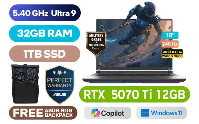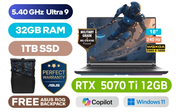 ASUS ROG Strix G18 Intel® Core™ Ultra 9 275HX up to 5.40GHz Processor, 76MB Cache, 24x Cores, 24x Threads / 32GB DDR5 RAM / 1TB Ultra-Fast PCIe NVMe SSD / 18" WQXGA (2560 x 1600) 240Hz, IPS-level Display / NVIDIA GeForce RTX 5070 Ti 12GB GDDR7 Dedicated Graphics / Windows 11 Home (64bit) / 1080P FHD IR Camera / Intel Wi-Fi 7 802.11be Wireless LAN / Bluetooth 5.4 / 3x USB Type-A / 2x USB Type-C (Thunderbolt™ 5 / DisplayPort™ / Power Delivery) / 1x HDMI / 1x Headphone and Microphone Combo Jack / 1x RJ45 / RGB Backlit Keyboard / 2 speaker system with Dolby Atmos Audio / FREE ASUS ROG Backpack / ASUS ROG Strix G18 Intel® Core™ Ultra 9 RTX 5070 Ti Gaming Laptop DealASUS ROG Strix G18 Intel® Core™ Ultra 9 275HX up to 5.40GHz Processor, 76MB Cache, 24x Cores, 24x Threads / 32GB DDR5 RAM / 1TB Ultra-Fast PCIe NVMe SSD / 18" WQXGA (2560 x 1600) 240Hz, IPS-level Display / NVIDIA GeForce RTX 5070 Ti 12GB GDDR7 Dedicated Graphics / Windows 11 Home (64bit) / 1080P FHD IR Camera / Intel Wi-Fi 7 802.11be Wireless LAN / Bluetooth 5.4 / 3x USB Type-A / 2x USB Type-C (Thunderbolt™ 5 / DisplayPort™ / Power Delivery) / 1x HDMI / 1x Headphone and Microphone Combo Jack / 1x RJ45 / RGB Backlit Keyboard / 2 speaker system with Dolby Atmos Audio / FREE ASUS ROG Backpack / ASUS ROG Strix G18 Intel® Core™ Ultra 9 RTX 5070 Ti Gaming Laptop Deal [G815LR-U93210G0W] / 3 YEARS WARRANTY / [+]Get Resident Evil: Requiem with select GeForce RTX 50 Series (Standard Edition)+ FREE DELIVERY !