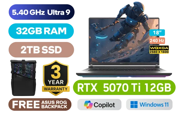 ASUS ROG Strix G18 Intel® Core™ Ultra 9 275HX up to 5.40GHz Processor, 76MB Cache, 24x Cores, 24x Threads / 32GB DDR5 RAM / 2TB Ultra-Fast PCIe NVMe SSD / 18" WQXGA (2560 x 1600) 240Hz, IPS-level Display / NVIDIA GeForce RTX 5070 Ti 12GB GDDR7 Dedicated Graphics / Windows 11 Home (64bit) / 1080P FHD IR Camera / Intel Wi-Fi 7 802.11be Wireless LAN / Bluetooth 5.4 / 3x USB Type-A / 2x USB Type-C (Thunderbolt™ 5 / DisplayPort™ / Power Delivery) / 1x HDMI / 1x Headphone and Microphone Combo Jack / 1x RJ45 / RGB Backlit Keyboard / 2 speaker system with Dolby Atmos Audio / FREE ASUS ROG Backpack / ASUS ROG Strix G18 Intel® Core™ Ultra 9 RTX 5070 Ti Gaming Laptop DealASUS ROG Strix G18 Intel® Core™ Ultra 9 275HX up to 5.40GHz Processor, 76MB Cache, 24x Cores, 24x Threads / 32GB DDR5 RAM / 2TB Ultra-Fast PCIe NVMe SSD / 18" WQXGA (2560 x 1600) 240Hz, IPS-level Display / NVIDIA GeForce RTX 5070 Ti 12GB GDDR7 Dedicated Graphics / Windows 11 Home (64bit) / 1080P FHD IR Camera / Intel Wi-Fi 7 802.11be Wireless LAN / Bluetooth 5.4 / 3x USB Type-A / 2x USB Type-C (Thunderbolt™ 5 / DisplayPort™ / Power Delivery) / 1x HDMI / 1x Headphone and Microphone Combo Jack / 1x RJ45 / RGB Backlit Keyboard / 2 speaker system with Dolby Atmos Audio / FREE ASUS ROG Backpack / ASUS ROG Strix G18 Intel® Core™ Ultra 9 RTX 5070 Ti Gaming Laptop Deal [G815LR-U93210G0W/2TB] / 3 YEARS WARRANTY / [+]Get Resident Evil Requiem with select GeForce RTX 50 Series (Standard Edition)+ FREE DELIVERY !