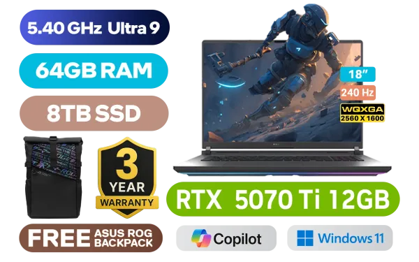 ASUS ROG Strix G18 Intel® Core™ Ultra 9 275HX up to 5.40GHz Processor, 76MB Cache, 24x Cores, 24x Threads / 64GB DDR5 RAM / 8TB Ultra-Fast PCIe NVMe SSD / 18" WQXGA (2560 x 1600) 240Hz, IPS-level Display / NVIDIA GeForce RTX 5070 Ti 12GB GDDR7 Dedicated Graphics / Windows 11 Home (64bit) / 1080P FHD IR Camera / Intel Wi-Fi 7 802.11be Wireless LAN / Bluetooth 5.4 / 3x USB Type-A / 2x USB Type-C (Thunderbolt™ 5 / DisplayPort™ / Power Delivery) / 1x HDMI / 1x Headphone and Microphone Combo Jack / 1x RJ45 / RGB Backlit Keyboard / 2 speaker system with Dolby Atmos Audio / FREE ASUS ROG Backpack / ASUS ROG Strix G18 Intel® Core™ Ultra 9 RTX 5070 Ti Gaming Laptop DealASUS ROG Strix G18 Intel® Core™ Ultra 9 275HX up to 5.40GHz Processor, 76MB Cache, 24x Cores, 24x Threads / 64GB DDR5 RAM / 8TB Ultra-Fast PCIe NVMe SSD / 18" WQXGA (2560 x 1600) 240Hz, IPS-level Display / NVIDIA GeForce RTX 5070 Ti 12GB GDDR7 Dedicated Graphics / Windows 11 Home (64bit) / 1080P FHD IR Camera / Intel Wi-Fi 7 802.11be Wireless LAN / Bluetooth 5.4 / 3x USB Type-A / 2x USB Type-C (Thunderbolt™ 5 / DisplayPort™ / Power Delivery) / 1x HDMI / 1x Headphone and Microphone Combo Jack / 1x RJ45 / RGB Backlit Keyboard / 2 speaker system with Dolby Atmos Audio / FREE ASUS ROG Backpack / ASUS ROG Strix G18 Intel® Core™ Ultra 9 RTX 5070 Ti Gaming Laptop Deal [G815LR-U93210G0W/64GB/8TB] / 3 YEARS WARRANTY / [+]Get Resident Evil Requiem with select GeForce RTX 50 Series (Standard Edition)+ FREE DELIVERY !
