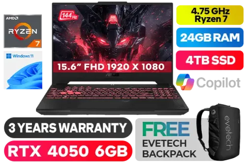 ASUS TUF Gaming A15 FA507NU AMD Ryzen™ 7 7735HS up to 4.75GHz Processor with AMD Max Boost Clock Technology, 20MB Cache, 8x Cores, 16x Threads / 24GB DDR5 RAM / 4TB Ultra-Fast NVMe SSD / 15.6" FHD 1920x1080 Anti-Glare 144Hz, IPS Level Display / NVIDIA GeForce RTX 4050 6GB GDDR6 Dedicated Graphics / Windows 11 Home (64bit) / Chiclet RGB Backlit Keyboard / Bluetooth 5.3 / Wi-Fi 6 Wireless LAN / 1 x Gigabit Lan Port (RJ45) / 2 x USB 3.2 Type-A / 2x USB 3.2 Type-C / 1 x HDMI / 1x Microphone and Headphone Combo jack / 720P HD camera / 2 speaker with Dolby Atmos Audio / ASUS TUF A15 Ryzen 7 RTX 4050 Gaming Laptop DealASUS TUF Gaming A15 FA507NU AMD Ryzen™ 7 7735HS up to 4.75GHz Processor with AMD Max Boost Clock Technology, 20MB Cache, 8x Cores, 16x Threads / 24GB DDR5 RAM / 4TB Ultra-Fast NVMe SSD / 15.6" FHD 1920x1080 Anti-Glare 144Hz, IPS Level Display / NVIDIA GeForce RTX 4050 6GB GDDR6 Dedicated Graphics / Windows 11 Home (64bit) / Chiclet RGB Backlit Keyboard / Bluetooth 5.3 / Wi-Fi 6 Wireless LAN / 1 x Gigabit Lan Port (RJ45) / 2 x USB 3.2 Type-A / 2x USB 3.2 Type-C / 1 x HDMI / 1x Microphone and Headphone Combo jack / 720P HD camera / 2 speaker with Dolby Atmos Audio / ASUS TUF A15 Ryzen 7 RTX 4050 Gaming Laptop Deal [FA507NU-716512G0W/24GB/4TB] / 3 YEARS WARRANTY / [+] GET FREE EVETECH NEO Premium Gaming Backpack+ FREE DELIVERY !