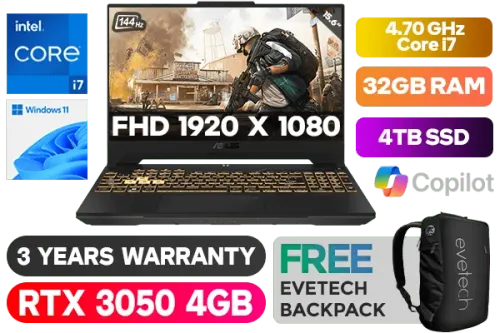 ASUS TUF Gaming F15 FX507 12th Gen Intel Core i7-12700H up to 4.70GHz Processor, 24MB Cache, 14x Cores, 20x Threads / 32GB DDR4 RAM / 4TB Ultra-Fast NVMe SSD / 15.6" FHD 1920x1080 144hz Refresh-rate Anti-Glare Display / NVIDIA 30 Series GeForce RTX 3050 4GB GDDR6 Dedicated Graphics / Windows 11 Home (64bit) / Intel WiFi 6 Wireless LAN / Bluetooth 5.2 / 720P HD Web Camera / 2x USB Type-A / 2x USB Type-C (ThunderBolt, DisplayPort™ & Power Delivery & G-SYNC) / 1x HDMI / 1x Headphone & Microphone Combo Jack / 1x RJ45 / RGB Backlit chicklet keyboard / 2-Speaker System / ASUS TUF F15 FX507 Core i7 RTX 3050 Gaming LaptopASUS TUF Gaming F15 FX507 12th Gen Intel Core i7-12700H up to 4.70GHz Processor, 24MB Cache, 14x Cores, 20x Threads / 32GB DDR4 RAM / 4TB Ultra-Fast NVMe SSD / 15.6" FHD 1920x1080 144hz Refresh-rate Anti-Glare Display / NVIDIA 30 Series GeForce RTX 3050 4GB GDDR6 Dedicated Graphics / Windows 11 Home (64bit) / Intel WiFi 6 Wireless LAN / Bluetooth 5.2 / 720P HD Web Camera / 2x USB Type-A / 2x USB Type-C (ThunderBolt, DisplayPort™ & Power Delivery & G-SYNC) / 1x HDMI / 1x Headphone & Microphone Combo Jack / 1x RJ45 / RGB Backlit chicklet keyboard / 2-Speaker System / ASUS TUF F15 FX507 Core i7 RTX 3050 Gaming Laptop [FX507ZC4-I71610G0W/32GB/4TB] / 3 YEARS WARRANTY / [+] GET FREE EVETECH NEO Premium Gaming Backpack+ FREE DELIVERY !