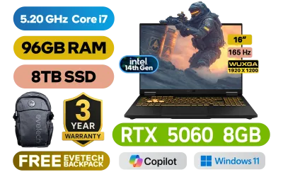 ASUS TUF Gaming F16 FX608JMR 14th Gen Intel® Core™ i7-14650HX up to 5.20GHz Processor, 30MB Cache, 16x Cores, 24x Threads / 96GB DDR5 RAM / 8TB Ultra-Fast NVMe SSD / 16" WUXGA(1920 x 1200) 165Hz, IPS-level Display / NVIDIA GeForce RTX 5060 8GB GDDR7 Dedicated Graphics / Windows 11 Home (64bit) / 1080P FHD IR Web Camera / Wi-Fi® 6E 8852CE Wireless LAN / Bluetooth 5.3 / 1x Headphone & Microphone Combo Jack / 3x USB Type-A / 2x USB Type-C (DisplayPort™ / G-SYNC) / 1x HDMI / 1x RJ45 / RGB Backlit Chicklet Keyboard / Dolby Atmos Audio system with AI noise-cancelling / ASUS TUF Gaming F16 FX608JMR Core i7 RTX 5060 Gaming LaptopASUS TUF Gaming F16 FX608JMR 14th Gen Intel® Core™ i7-14650HX up to 5.20GHz Processor, 30MB Cache, 16x Cores, 24x Threads / 96GB DDR5 RAM / 8TB Ultra-Fast NVMe SSD / 16" WUXGA(1920 x 1200) 165Hz, IPS-level Display / NVIDIA GeForce RTX 5060 8GB GDDR7 Dedicated Graphics / Windows 11 Home (64bit) / 1080P FHD IR Web Camera / Wi-Fi® 6E 8852CE Wireless LAN / Bluetooth 5.3 / 1x Headphone & Microphone Combo Jack / 3x USB Type-A / 2x USB Type-C (DisplayPort™ / G-SYNC) / 1x HDMI / 1x RJ45 / RGB Backlit Chicklet Keyboard / Dolby Atmos Audio system with AI noise-cancelling / ASUS TUF Gaming F16 FX608JMR Core i7 RTX 5060 Gaming Laptop [FX608JMR-I71610G0W/96GB/8TB] / 3 YEARS WARRANTY / [+] GET FREE EVETECH FLUX Premium Gaming Backpack+ FREE DELIVERY !