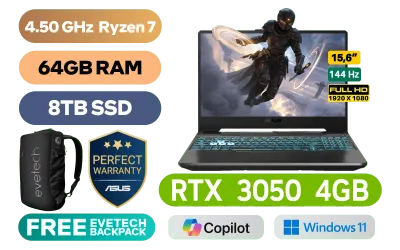 ASUS TUF Gaming FA506NCR A15 AMD Ryzen 7-7435HS up to 4.50GHz Processor, 20MB Cache, 8x Cores, 16x Threads / 64GB DDR5 RAM / 8TB Ultra-Fast NVMe SSD / 15.6" FHD 1920x1080 Anti-Glare 144Hz, IPS Level Thin-Bezel Display / NVIDIA 30 Series GeForce RTX 3050 4GB GDDR6 Dedicated Graphics / Windows 11 Home (64bit) / 720P HD Web Camera / Bluetooth 5.3 / Realtek RTL8852BE Wi-Fi 6 Wireless LAN / 3 x USB Type-A / 1x Type C USB Gen 2 / 1 x HDMI / 1x Microphone and Headphone Combo jack / 1x RJ-45 / Backlit Chiclet Keyboard 1-Zone RGB / 2x speakers with DTS software / ASUS TUF Gaming A15 FA506NCR Ryzen 7 RTX 3050 Gaming Laptop DealASUS TUF Gaming FA506NCR A15 AMD Ryzen 7-7435HS up to 4.50GHz Processor, 20MB Cache, 8x Cores, 16x Threads / 64GB DDR5 RAM / 8TB Ultra-Fast NVMe SSD / 15.6" FHD 1920x1080 Anti-Glare 144Hz, IPS Level Thin-Bezel Display / NVIDIA 30 Series GeForce RTX 3050 4GB GDDR6 Dedicated Graphics / Windows 11 Home (64bit) / 720P HD Web Camera / Bluetooth 5.3 / Realtek RTL8852BE Wi-Fi 6 Wireless LAN / 3 x USB Type-A / 1x Type C USB Gen 2 / 1 x HDMI / 1x Microphone and Headphone Combo jack / 1x RJ-45 / Backlit Chiclet Keyboard 1-Zone RGB / 2x speakers with DTS software / ASUS TUF Gaming A15 FA506NCR Ryzen 7 RTX 3050 Gaming Laptop Deal [FA506NCR-78512B0W-E/64GB/8TB] / [+] GET FREE EVETECH NEO Premium Gaming Backpack / 3 YEARS WARRANTY / [+] GET FREE Logitech M185 Wireless Mouse / [+] GET ASUS TUF Gaming AX3000 V2 Dual Band WiFi 6 Gaming Router+ FREE DELIVERY !