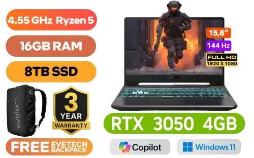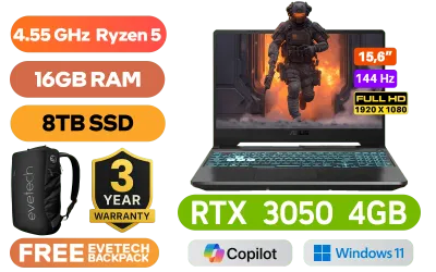 ASUS TUF Gaming A15 AMD Ryzen 5 7535HS up to 4.55GHz Processor, 19MB Cache, 6x Cores, 12x Threads / 16GB DDR5 RAM / 8TB Ultra-Fast NVMe SSD / 15.6" FHD 1920x1080 Anti-Glare 144Hz, IPS Level Thin-Bezel Display / NVIDIA 30 Series GeForce RTX 3050 4GB GDDR6 Dedicated Graphics / Windows 11 Home (64bit) / 720P HD Web Camera / Bluetooth 5.3 / Realtek RTL8852BE Wi-Fi 6 Wireless LAN / 3 x USB Type-A / 1x Type C USB Gen 2 / 1 x HDMI / 1x Microphone and Headphone Combo jack / 1x RJ-45 / Backlit Chiclet Keyboard 1-Zone RGB / 2x speakers with DTS software / ASUS TUF Gaming A15 FA506NC Ryzen 5 RTX 3050 Gaming Laptop DealASUS TUF Gaming A15 AMD Ryzen 5 7535HS up to 4.55GHz Processor, 19MB Cache, 6x Cores, 12x Threads / 16GB DDR5 RAM / 8TB Ultra-Fast NVMe SSD / 15.6" FHD 1920x1080 Anti-Glare 144Hz, IPS Level Thin-Bezel Display / NVIDIA 30 Series GeForce RTX 3050 4GB GDDR6 Dedicated Graphics / Windows 11 Home (64bit) / 720P HD Web Camera / Bluetooth 5.3 / Realtek RTL8852BE Wi-Fi 6 Wireless LAN / 3 x USB Type-A / 1x Type C USB Gen 2 / 1 x HDMI / 1x Microphone and Headphone Combo jack / 1x RJ-45 / Backlit Chiclet Keyboard 1-Zone RGB / 2x speakers with DTS software / ASUS TUF Gaming A15 FA506NC Ryzen 5 RTX 3050 Gaming Laptop Deal [FA506NC-58512B0W/16GB/8TB] / [+] GET FREE EVETECH NEO Premium Gaming Backpack / 3 YEARS WARRANTY + FREE DELIVERY !