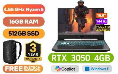 ASUS TUF Gaming A15 AMD Ryzen 5 7535HS up to 4.55GHz Processor, 19MB Cache, 6x Cores, 12x Threads / 16GB DDR5 RAM / 512GB Ultra-Fast NVMe SSD / 15.6" FHD 1920x1080 Anti-Glare 144Hz, IPS Level Thin-Bezel Display / NVIDIA 30 Series GeForce RTX 3050 4GB GDDR6 Dedicated Graphics / Windows 11 Home (64bit) / 720P HD Web Camera / Bluetooth 5.3 / Realtek RTL8852BE Wi-Fi 6 Wireless LAN / 3 x USB Type-A / 1x Type C USB Gen 2 / 1 x HDMI / 1x Microphone and Headphone Combo jack / 1x RJ-45 / Backlit Chiclet Keyboard 1-Zone RGB / 2x speakers with DTS software / ASUS TUF Gaming A15 FA506NC Ryzen 5 RTX 3050 Gaming Laptop DealASUS TUF Gaming A15 AMD Ryzen 5 7535HS up to 4.55GHz Processor, 19MB Cache, 6x Cores, 12x Threads / 16GB DDR5 RAM / 512GB Ultra-Fast NVMe SSD / 15.6" FHD 1920x1080 Anti-Glare 144Hz, IPS Level Thin-Bezel Display / NVIDIA 30 Series GeForce RTX 3050 4GB GDDR6 Dedicated Graphics / Windows 11 Home (64bit) / 720P HD Web Camera / Bluetooth 5.3 / Realtek RTL8852BE Wi-Fi 6 Wireless LAN / 3 x USB Type-A / 1x Type C USB Gen 2 / 1 x HDMI / 1x Microphone and Headphone Combo jack / 1x RJ-45 / Backlit Chiclet Keyboard 1-Zone RGB / 2x speakers with DTS software / ASUS TUF Gaming A15 FA506NC Ryzen 5 RTX 3050 Gaming Laptop Deal [FA506NC-58512B0W/16GB] / [+] GET FREE EVETECH NEO Premium Gaming Backpack / 3 YEARS WARRANTY + FREE DELIVERY !