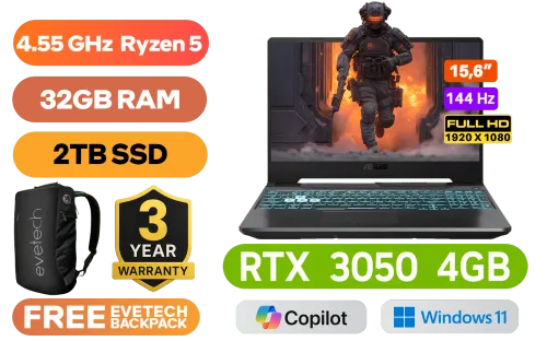 ASUS TUF Gaming A15 AMD Ryzen 5 7535HS up to 4.55GHz Processor, 19MB Cache, 6x Cores, 12x Threads / 32GB DDR5 RAM / 2TB Ultra-Fast NVMe SSD / 15.6" FHD 1920x1080 Anti-Glare 144Hz, IPS Level Thin-Bezel Display / NVIDIA 30 Series GeForce RTX 3050 4GB GDDR6 Dedicated Graphics / Windows 11 Home (64bit) / 720P HD Web Camera / Bluetooth 5.3 / Realtek RTL8852BE Wi-Fi 6 Wireless LAN / 3 x USB Type-A / 1x Type C USB Gen 2 / 1 x HDMI / 1x Microphone and Headphone Combo jack / 1x RJ-45 / Backlit Chiclet Keyboard 1-Zone RGB / 2x speakers with DTS software / ASUS TUF Gaming A15 FA506NC Ryzen 5 RTX 3050 Gaming Laptop DealASUS TUF Gaming A15 AMD Ryzen 5 7535HS up to 4.55GHz Processor, 19MB Cache, 6x Cores, 12x Threads / 32GB DDR5 RAM / 2TB Ultra-Fast NVMe SSD / 15.6" FHD 1920x1080 Anti-Glare 144Hz, IPS Level Thin-Bezel Display / NVIDIA 30 Series GeForce RTX 3050 4GB GDDR6 Dedicated Graphics / Windows 11 Home (64bit) / 720P HD Web Camera / Bluetooth 5.3 / Realtek RTL8852BE Wi-Fi 6 Wireless LAN / 3 x USB Type-A / 1x Type C USB Gen 2 / 1 x HDMI / 1x Microphone and Headphone Combo jack / 1x RJ-45 / Backlit Chiclet Keyboard 1-Zone RGB / 2x speakers with DTS software / ASUS TUF Gaming A15 FA506NC Ryzen 5 RTX 3050 Gaming Laptop Deal [FA506NC-58512B0W/32GB/2TB] / [+] GET FREE EVETECH NEO Premium Gaming Backpack / 3 YEARS WARRANTY + FREE DELIVERY !