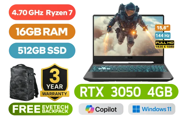 ASUS TUF Gaming A15 FA506NCG AMD Ryzen 7-7445HS up to 4.70GHz Processor, 22MB Cache, 6x Cores, 12x Threads / 16GB DDR5 RAM / 512GB Ultra-Fast NVMe SSD / 15.6" FHD (1920 x 1080)144Hz, IPS-Level Display / NVIDIA 30 Series GeForce RTX 3050 4GB GDDR6 Dedicated Graphics / Windows 11 Home (64bit) / Realtek RTL8852BE Wi-Fi 6 Wireless LAN / Bluetooth 5.3 / 720P HD Web Camera / 3 x USB Type-A / 1x USB Type-C(Supports DisplayPort™) / 1 x HDMI / 1x Microphone and Headphone Combo jack / 1x RJ-45 / RGB Backlit Chiclet Keyboard / 2x speakers with DTS software / ASUS TUF Gaming A15 FA506NCG Ryzen 7 RTX 3050 Gaming Laptop DealASUS TUF Gaming A15 FA506NCG AMD Ryzen 7-7445HS up to 4.70GHz Processor, 22MB Cache, 6x Cores, 12x Threads / 16GB DDR5 RAM / 512GB Ultra-Fast NVMe SSD / 15.6" FHD (1920 x 1080)144Hz, IPS-Level Display / NVIDIA 30 Series GeForce RTX 3050 4GB GDDR6 Dedicated Graphics / Windows 11 Home (64bit) / Realtek RTL8852BE Wi-Fi 6 Wireless LAN / Bluetooth 5.3 / 720P HD Web Camera / 3 x USB Type-A / 1x USB Type-C(Supports DisplayPort™) / 1 x HDMI / 1x Microphone and Headphone Combo jack / 1x RJ-45 / RGB Backlit Chiclet Keyboard / 2x speakers with DTS software / ASUS TUF Gaming A15 FA506NCG Ryzen 7 RTX 3050 Gaming Laptop Deal [FA506NCG-78512B0W/16GB] / 3 YEARS WARRANTY / [+] GET FREE Logitech M185 Wireless Mouse / [+] GET FREE EVETECH DASH Premium Gaming Backpack+ FREE DELIVERY !