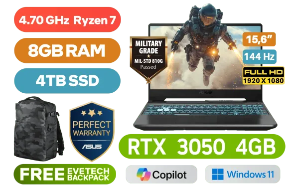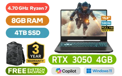ASUS TUF Gaming A15 FA506NCG AMD Ryzen 7-7445HS up to 4.70GHz Processor, 22MB Cache, 6x Cores, 12x Threads / 8GB DDR5 RAM / 4TB Ultra-Fast NVMe SSD / 15.6" FHD (1920 x 1080)144Hz, IPS-Level Display / NVIDIA 30 Series GeForce RTX 3050 4GB GDDR6 Dedicated Graphics / Windows 11 Home (64bit) / Realtek RTL8852BE Wi-Fi 6 Wireless LAN / Bluetooth 5.3 / 720P HD Web Camera / 3 x USB Type-A / 1x USB Type-C(Supports DisplayPort™) / 1 x HDMI / 1x Microphone and Headphone Combo jack / 1x RJ-45 / RGB Backlit Chiclet Keyboard / 2x speakers with DTS software / ASUS TUF Gaming A15 FA506NCG Ryzen 7 RTX 3050 Gaming Laptop DealASUS TUF Gaming A15 FA506NCG AMD Ryzen 7-7445HS up to 4.70GHz Processor, 22MB Cache, 6x Cores, 12x Threads / 8GB DDR5 RAM / 4TB Ultra-Fast NVMe SSD / 15.6" FHD (1920 x 1080)144Hz, IPS-Level Display / NVIDIA 30 Series GeForce RTX 3050 4GB GDDR6 Dedicated Graphics / Windows 11 Home (64bit) / Realtek RTL8852BE Wi-Fi 6 Wireless LAN / Bluetooth 5.3 / 720P HD Web Camera / 3 x USB Type-A / 1x USB Type-C(Supports DisplayPort™) / 1 x HDMI / 1x Microphone and Headphone Combo jack / 1x RJ-45 / RGB Backlit Chiclet Keyboard / 2x speakers with DTS software / ASUS TUF Gaming A15 FA506NCG Ryzen 7 RTX 3050 Gaming Laptop Deal [FA506NCG-78512B0W/4TB] / 3 YEARS WARRANTY / [+] GET FREE Logitech M185 Wireless Mouse / [+] GET FREE EVETECH DASH Premium Gaming Backpack+ FREE DELIVERY !