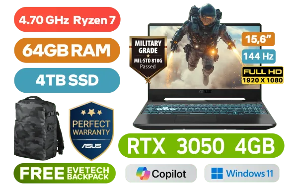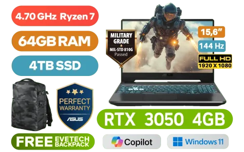 ASUS TUF Gaming A15 FA506NCG AMD Ryzen 7-7445HS up to 4.70GHz Processor, 22MB Cache, 6x Cores, 12x Threads / 64GB DDR5 RAM / 4TB Ultra-Fast NVMe SSD / 15.6" FHD (1920 x 1080)144Hz, IPS-Level Display / NVIDIA 30 Series GeForce RTX 3050 4GB GDDR6 Dedicated Graphics / Windows 11 Home (64bit) / Realtek RTL8852BE Wi-Fi 6 Wireless LAN / Bluetooth 5.3 / 720P HD Web Camera / 3 x USB Type-A / 1x USB Type-C(Supports DisplayPort™) / 1 x HDMI / 1x Microphone and Headphone Combo jack / 1x RJ-45 / RGB Backlit Chiclet Keyboard / 2x speakers with DTS software / ASUS TUF Gaming A15 FA506NCG Ryzen 7 RTX 3050 Gaming Laptop DealASUS TUF Gaming A15 FA506NCG AMD Ryzen 7-7445HS up to 4.70GHz Processor, 22MB Cache, 6x Cores, 12x Threads / 64GB DDR5 RAM / 4TB Ultra-Fast NVMe SSD / 15.6" FHD (1920 x 1080)144Hz, IPS-Level Display / NVIDIA 30 Series GeForce RTX 3050 4GB GDDR6 Dedicated Graphics / Windows 11 Home (64bit) / Realtek RTL8852BE Wi-Fi 6 Wireless LAN / Bluetooth 5.3 / 720P HD Web Camera / 3 x USB Type-A / 1x USB Type-C(Supports DisplayPort™) / 1 x HDMI / 1x Microphone and Headphone Combo jack / 1x RJ-45 / RGB Backlit Chiclet Keyboard / 2x speakers with DTS software / ASUS TUF Gaming A15 FA506NCG Ryzen 7 RTX 3050 Gaming Laptop Deal [FA506NCG-78512B0W/64GB/4TB] / 3 YEARS WARRANTY / [+] GET FREE Logitech M185 Wireless Mouse / [+] GET FREE EVETECH DASH Premium Gaming Backpack+ FREE DELIVERY !
