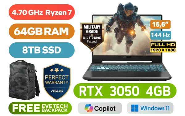 ASUS TUF Gaming A15 FA506NCG AMD Ryzen 7-7445HS up to 4.70GHz Processor, 22MB Cache, 6x Cores, 12x Threads / 64GB DDR5 RAM / 8TB Ultra-Fast NVMe SSD / 15.6" FHD (1920 x 1080)144Hz, IPS-Level Display / NVIDIA 30 Series GeForce RTX 3050 4GB GDDR6 Dedicated Graphics / Windows 11 Home (64bit) / Realtek RTL8852BE Wi-Fi 6 Wireless LAN / Bluetooth 5.3 / 720P HD Web Camera / 3 x USB Type-A / 1x USB Type-C(Supports DisplayPort™) / 1 x HDMI / 1x Microphone and Headphone Combo jack / 1x RJ-45 / RGB Backlit Chiclet Keyboard / 2x speakers with DTS software / ASUS TUF Gaming A15 FA506NCG Ryzen 7 RTX 3050 Gaming Laptop DealASUS TUF Gaming A15 FA506NCG AMD Ryzen 7-7445HS up to 4.70GHz Processor, 22MB Cache, 6x Cores, 12x Threads / 64GB DDR5 RAM / 8TB Ultra-Fast NVMe SSD / 15.6" FHD (1920 x 1080)144Hz, IPS-Level Display / NVIDIA 30 Series GeForce RTX 3050 4GB GDDR6 Dedicated Graphics / Windows 11 Home (64bit) / Realtek RTL8852BE Wi-Fi 6 Wireless LAN / Bluetooth 5.3 / 720P HD Web Camera / 3 x USB Type-A / 1x USB Type-C(Supports DisplayPort™) / 1 x HDMI / 1x Microphone and Headphone Combo jack / 1x RJ-45 / RGB Backlit Chiclet Keyboard / 2x speakers with DTS software / ASUS TUF Gaming A15 FA506NCG Ryzen 7 RTX 3050 Gaming Laptop Deal [FA506NCG-78512B0W/64GB/8TB] / 3 YEARS WARRANTY / [+] GET FREE Logitech M185 Wireless Mouse / [+] GET FREE EVETECH DASH Premium Gaming Backpack+ FREE DELIVERY !