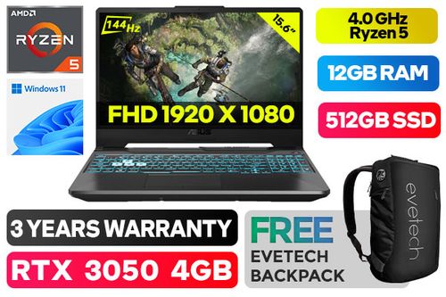 ASUS TUF Gaming A15 AMD Ryzen 5 4600H up to 4.0GHz Processor with AMD max boost clock Technology, 11MB Cache, 6x Cores, 12x Threads / 12GB DDR4 RAM / 512GB Ultra-Fast NVMe SSD / 15.6" FHD 1920x1080 Anti-Glare 144Hz, IPS Level Thin-Bezel Display / NVIDIA 30 Series GeForce RTX 3050 4GB GDDR6 Dedicated Graphics / Windows 11 Home (64bit) / 720P HD Web Camera / Bluetooth v5.2 / 802.11 ax Wi-Fi 6 Wireless LAN / 3 x USB 3.2 Type-A / 1x Type C USB 3.2 Gen 2 / 1 x HDMI / 1x Microphone and Headphone Combo jack / Chiclet <span style="font-size: 20px; color: rgb(255, 0, 0);">R</span><span style="font-size: 20px; color: rgb(51, 153, 0);">G</span><span style="font-size: 20px; color: rgb(51, 102, 255);">B</span> Backlit Keyboard / 2x 4.2W speaker with smart AMP technology / ASUS TUF Gaming A15 FA506IC Ryzen 5 RTX 3050 Gaming Laptop DealASUS TUF Gaming A15 AMD Ryzen 5 4600H up to 4.0GHz Processor with AMD max boost clock Technology, 11MB Cache, 6x Cores, 12x Threads / 12GB DDR4 RAM / 512GB Ultra-Fast NVMe SSD / 15.6" FHD 1920x1080 Anti-Glare 144Hz, IPS Level Thin-Bezel Display / NVIDIA 30 Series GeForce RTX 3050 4GB GDDR6 Dedicated Graphics / Windows 11 Home (64bit) / 720P HD Web Camera / Bluetooth v5.2 / 802.11 ax Wi-Fi 6 Wireless LAN / 3 x USB 3.2 Type-A / 1x Type C USB 3.2 Gen 2 / 1 x HDMI / 1x Microphone and Headphone Combo jack / Chiclet RGB Backlit Keyboard / 2x 4.2W speaker with smart AMP technology / ASUS TUF Gaming A15 FA506IC Ryzen 5 RTX 3050 Gaming Laptop Deal [FA506IC-58512B0W/12GB] / 3 YEARS WARRANTY / [+] GET FREE EVETECH NEO Premium Gaming Backpack+ FREE DELIVERY !