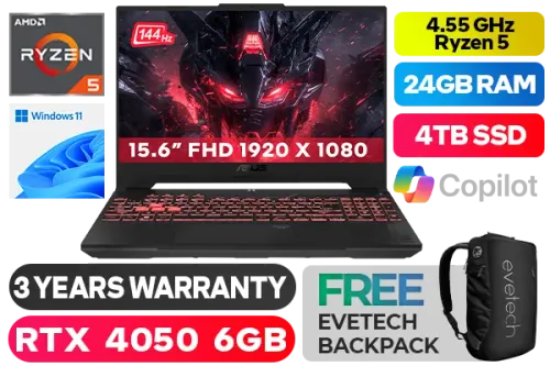 ASUS TUF Gaming A15 FA507NU AMD Ryzen™ 5 7535HS up to 4.55GHz Processor with AMD Max Boost Clock Technology, 19MB Cache, 6x Cores, 12x Threads / 24GB DDR5 RAM / 4TB Ultra-Fast NVMe SSD / 15.6" FHD 1920x1080 Anti-Glare 144Hz, IPS Level Display / NVIDIA GeForce RTX 4050 6GB GDDR6 Dedicated Graphics / Windows 11 Home (64bit) / Chiclet RGB Backlit Keyboard / Bluetooth v5.3 / Wi-Fi 6 Wireless LAN / 1 x Gigabit Lan Port (RJ45) / 2 x USB Type-A / 2x USB Type-C / 1 x HDMI / 1x Microphone and Headphone Combo jack / 720P HD camera / 2 speaker with Dolby Atmos Audio / ASUS TUF Gaming A15 Ryzen 5 RTX 4050 Gaming Laptop DealASUS TUF Gaming A15 FA507NU AMD Ryzen™ 5 7535HS up to 4.55GHz Processor with AMD Max Boost Clock Technology, 19MB Cache, 6x Cores, 12x Threads / 24GB DDR5 RAM / 4TB Ultra-Fast NVMe SSD / 15.6" FHD 1920x1080 Anti-Glare 144Hz, IPS Level Display / NVIDIA GeForce RTX 4050 6GB GDDR6 Dedicated Graphics / Windows 11 Home (64bit) / Chiclet RGB Backlit Keyboard / Bluetooth v5.3 / Wi-Fi 6 Wireless LAN / 1 x Gigabit Lan Port (RJ45) / 2 x USB Type-A / 2x USB Type-C / 1 x HDMI / 1x Microphone and Headphone Combo jack / 720P HD camera / 2 speaker with Dolby Atmos Audio / ASUS TUF Gaming A15 Ryzen 5 RTX 4050 Gaming Laptop Deal [FA507NU-58512G0W/24GB/4TB] / 3 YEARS WARRANTY / [+] GET FREE EVETECH NEO Premium Gaming Backpack+ FREE DELIVERY !