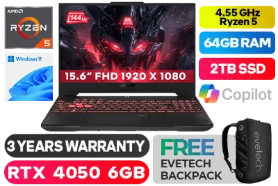 ASUS TUF Gaming A15 FA507NU AMD Ryzen™ 5 7535HS up to 4.55GHz Processor with AMD Max Boost Clock Technology, 19MB Cache, 6x Cores, 12x Threads / 64GB DDR5 RAM / 2TB Ultra-Fast NVMe SSD / 15.6" FHD 1920x1080 Anti-Glare 144Hz, IPS Level Display / NVIDIA GeForce RTX 4050 6GB GDDR6 Dedicated Graphics / Windows 11 Home (64bit) / Chiclet RGB Backlit Keyboard / Bluetooth v5.3 / Wi-Fi 6 Wireless LAN / 1 x Gigabit Lan Port (RJ45) / 2 x USB Type-A / 2x USB Type-C / 1 x HDMI / 1x Microphone and Headphone Combo jack / 720P HD camera / 2 speaker with Dolby Atmos Audio / ASUS TUF Gaming A15 Ryzen 5 RTX 4050 Gaming Laptop DealASUS TUF Gaming A15 FA507NU AMD Ryzen™ 5 7535HS up to 4.55GHz Processor with AMD Max Boost Clock Technology, 19MB Cache, 6x Cores, 12x Threads / 64GB DDR5 RAM / 2TB Ultra-Fast NVMe SSD / 15.6" FHD 1920x1080 Anti-Glare 144Hz, IPS Level Display / NVIDIA GeForce RTX 4050 6GB GDDR6 Dedicated Graphics / Windows 11 Home (64bit) / Chiclet RGB Backlit Keyboard / Bluetooth v5.3 / Wi-Fi 6 Wireless LAN / 1 x Gigabit Lan Port (RJ45) / 2 x USB Type-A / 2x USB Type-C / 1 x HDMI / 1x Microphone and Headphone Combo jack / 720P HD camera / 2 speaker with Dolby Atmos Audio / ASUS TUF Gaming A15 Ryzen 5 RTX 4050 Gaming Laptop Deal [FA507NU-58512G0W/64GB/2TB] / 3 YEARS WARRANTY / [+] GET FREE EVETECH NEO Premium Gaming Backpack+ FREE DELIVERY !