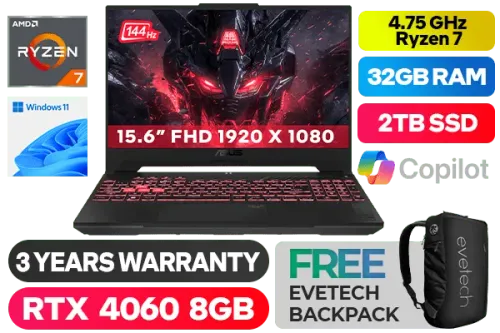 ASUS TUF Gaming A15 FA507NV AMD Ryzen™ 7 7735HS up to 4.75GHz Processor with AMD Max Boost Clock Technology, 20MB Cache, 8x Cores, 16x Threads / 32GB DDR5 RAM / 2TB Ultra-Fast NVMe SSD / 15.6" FHD 1920x1080 Anti-Glare 144Hz, IPS Level Display / NVIDIA 40 Series GeForce RTX 4060 8GB GDDR6 Dedicated Graphics / Windows 11 Home (64bit) / Chiclet RGB Backlit Keyboard / Bluetooth v5.2 / Wi-Fi 6 Wireless LAN / 1 x Gigabit Ethernet RJ-45 / 2 x USB Type-A / 2x USB Type-C / 1 x HDMI / 1x Microphone and Headphone Combo jack / 720P HD camera / 2x speaker with Dolby Atmos Audio / ASUS TUF Gaming A15 Ryzen 7 RTX 4060 Gaming Laptop DealASUS TUF Gaming A15 FA507NV AMD Ryzen™ 7 7735HS up to 4.75GHz Processor with AMD Max Boost Clock Technology, 20MB Cache, 8x Cores, 16x Threads / 32GB DDR5 RAM / 2TB Ultra-Fast NVMe SSD / 15.6" FHD 1920x1080 Anti-Glare 144Hz, IPS Level Display / NVIDIA 40 Series GeForce RTX 4060 8GB GDDR6 Dedicated Graphics / Windows 11 Home (64bit) / Chiclet RGB Backlit Keyboard / Bluetooth v5.2 / Wi-Fi 6 Wireless LAN / 1 x Gigabit Ethernet RJ-45 / 2 x USB Type-A / 2x USB Type-C / 1 x HDMI / 1x Microphone and Headphone Combo jack / 720P HD camera / 2x speaker with Dolby Atmos Audio / ASUS TUF Gaming A15 Ryzen 7 RTX 4060 Gaming Laptop Deal [FA507NV-71610G0W/32GB/2TB] / 3 YEARS WARRANTY / [+] GET FREE EVETECH NEO Premium Gaming Backpack+ FREE DELIVERY !