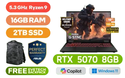 [G-SYNC] ASUS TUF Gaming A16 FA608PP AMD Ryzen 9 8940HX up to 5.3GHz Processor, 80MB Cache, 16x Cores, 32x Threads / 16GB DDR5 RAM / 2TB Ultra-Fast NVMe SSD / 16" WQXGA (2560x1600) 165Hz IPS-Level Display / NVIDIA 50 Series GeForce RTX 5070 8GB GDDR7 Dedicated Graphics / Windows 11 Home (64bit) / Realtek Wi-Fi 6E 8852CE Wireless LAN / Bluetooth 5.3 / 1080P FHD IR Camera / 3 x USB Type-A / 2x USB Type C (Supports DisplayPort™ / Power Delivery) / 1 x HDMI / 1x Headphone and Microphone Combo jack / 1x RJ-45 / RGB Backlit Keyboard / Dolby Atmos Audio with AI noise-canceling / ASUS TUF Gaming A16 FA608PP Ryzen 9 RTX 5070 Laptop Deal[G-SYNC] ASUS TUF Gaming A16 FA608PP AMD Ryzen 9 8940HX up to 5.3GHz Processor, 80MB Cache, 16x Cores, 32x Threads / 16GB DDR5 RAM / 2TB Ultra-Fast NVMe SSD / 16" WQXGA (2560x1600) 165Hz IPS-Level Display / NVIDIA 50 Series GeForce RTX 5070 8GB GDDR7 Dedicated Graphics / Windows 11 Home (64bit) / Realtek Wi-Fi 6E 8852CE Wireless LAN / Bluetooth 5.3 / 1080P FHD IR Camera / 3 x USB Type-A / 2x USB Type C (Supports DisplayPort™ / Power Delivery) / 1 x HDMI / 1x Headphone and Microphone Combo jack / 1x RJ-45 / RGB Backlit Keyboard / Dolby Atmos Audio with AI noise-canceling / ASUS TUF Gaming A16 FA608PP Ryzen 9 RTX 5070 Laptop Deal [FA608PP-91610G0W/2TB] / 3 YEARS WARRANTY / [+] GET FREE EVETECH DASH Premium Gaming Backpack / [+] Get PRAGMATA with select GeForce RTX 50 Series + FREE DELIVERY !