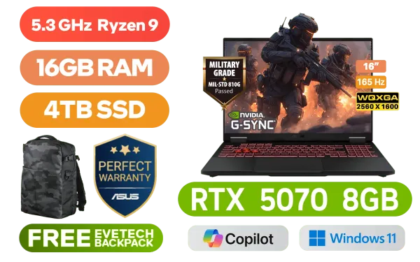 [G-SYNC] ASUS TUF Gaming A16 FA608PP AMD Ryzen 9 8940HX up to 5.3GHz Processor, 80MB Cache, 16x Cores, 32x Threads / 16GB DDR5 RAM / 4TB Ultra-Fast NVMe SSD / 16" WQXGA (2560x1600) 165Hz IPS-Level Display / NVIDIA 50 Series GeForce RTX 5070 8GB GDDR7 Dedicated Graphics / Windows 11 Home (64bit) / Realtek Wi-Fi 6E 8852CE Wireless LAN / Bluetooth 5.3 / 1080P FHD IR Camera / 3 x USB Type-A / 2x USB Type C (Supports DisplayPort™ / Power Delivery) / 1 x HDMI / 1x Headphone and Microphone Combo jack / 1x RJ-45 / RGB Backlit Keyboard / Dolby Atmos Audio with AI noise-canceling / ASUS TUF Gaming A16 FA608PP Ryzen 9 RTX 5070 Laptop Deal[G-SYNC] ASUS TUF Gaming A16 FA608PP AMD Ryzen 9 8940HX up to 5.3GHz Processor, 80MB Cache, 16x Cores, 32x Threads / 16GB DDR5 RAM / 4TB Ultra-Fast NVMe SSD / 16" WQXGA (2560x1600) 165Hz IPS-Level Display / NVIDIA 50 Series GeForce RTX 5070 8GB GDDR7 Dedicated Graphics / Windows 11 Home (64bit) / Realtek Wi-Fi 6E 8852CE Wireless LAN / Bluetooth 5.3 / 1080P FHD IR Camera / 3 x USB Type-A / 2x USB Type C (Supports DisplayPort™ / Power Delivery) / 1 x HDMI / 1x Headphone and Microphone Combo jack / 1x RJ-45 / RGB Backlit Keyboard / Dolby Atmos Audio with AI noise-canceling / ASUS TUF Gaming A16 FA608PP Ryzen 9 RTX 5070 Laptop Deal [FA608PP-91610G0W/4TB] / 3 YEARS WARRANTY / [+] GET FREE EVETECH DASH Premium Gaming Backpack / [+]Get Resident Evil: Requiem with select GeForce RTX 50 Series (Standard Edition)+ FREE DELIVERY !