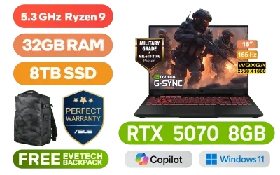 [G-SYNC] ASUS TUF Gaming A16 FA608PP AMD Ryzen 9 8940HX up to 5.3GHz Processor, 80MB Cache, 16x Cores, 32x Threads / 32GB DDR5 RAM / 8TB Ultra-Fast NVMe SSD / 16" WQXGA (2560x1600) 165Hz IPS-Level Display / NVIDIA 50 Series GeForce RTX 5070 8GB GDDR7 Dedicated Graphics / Windows 11 Home (64bit) / Realtek Wi-Fi 6E 8852CE Wireless LAN / Bluetooth 5.3 / 1080P FHD IR Camera / 3 x USB Type-A / 2x USB Type C (Supports DisplayPort™ / Power Delivery) / 1 x HDMI / 1x Headphone and Microphone Combo jack / 1x RJ-45 / RGB Backlit Keyboard / Dolby Atmos Audio with AI noise-canceling / ASUS TUF Gaming A16 FA608PP Ryzen 9 RTX 5070 Laptop Deal[G-SYNC] ASUS TUF Gaming A16 FA608PP AMD Ryzen 9 8940HX up to 5.3GHz Processor, 80MB Cache, 16x Cores, 32x Threads / 32GB DDR5 RAM / 8TB Ultra-Fast NVMe SSD / 16" WQXGA (2560x1600) 165Hz IPS-Level Display / NVIDIA 50 Series GeForce RTX 5070 8GB GDDR7 Dedicated Graphics / Windows 11 Home (64bit) / Realtek Wi-Fi 6E 8852CE Wireless LAN / Bluetooth 5.3 / 1080P FHD IR Camera / 3 x USB Type-A / 2x USB Type C (Supports DisplayPort™ / Power Delivery) / 1 x HDMI / 1x Headphone and Microphone Combo jack / 1x RJ-45 / RGB Backlit Keyboard / Dolby Atmos Audio with AI noise-canceling / ASUS TUF Gaming A16 FA608PP Ryzen 9 RTX 5070 Laptop Deal [FA608PP-91610G0W/32GB/8TB] / 3 YEARS WARRANTY / [+] GET FREE EVETECH DASH Premium Gaming Backpack / [+] Get PRAGMATA with select GeForce RTX 50 Series + FREE DELIVERY !