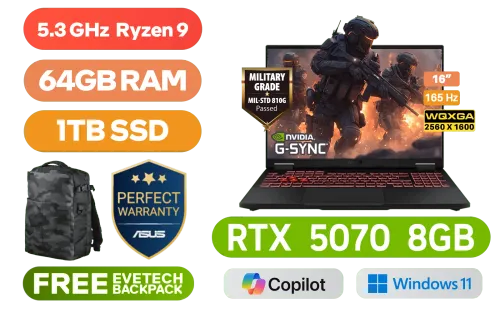 [G-SYNC] ASUS TUF Gaming A16 FA608PP AMD Ryzen 9 8940HX up to 5.3GHz Processor, 80MB Cache, 16x Cores, 32x Threads / 64GB DDR5 RAM / 1TB Ultra-Fast NVMe SSD / 16" WQXGA (2560x1600) 165Hz IPS-Level Display / NVIDIA 50 Series GeForce RTX 5070 8GB GDDR7 Dedicated Graphics / Windows 11 Home (64bit) / Realtek Wi-Fi 6E 8852CE Wireless LAN / Bluetooth 5.3 / 1080P FHD IR Camera / 3 x USB Type-A / 2x USB Type C (Supports DisplayPort™ / Power Delivery) / 1 x HDMI / 1x Headphone and Microphone Combo jack / 1x RJ-45 / RGB Backlit Keyboard / Dolby Atmos Audio with AI noise-canceling / ASUS TUF Gaming A16 FA608PP Ryzen 9 RTX 5070 Laptop Deal[G-SYNC] ASUS TUF Gaming A16 FA608PP AMD Ryzen 9 8940HX up to 5.3GHz Processor, 80MB Cache, 16x Cores, 32x Threads / 64GB DDR5 RAM / 1TB Ultra-Fast NVMe SSD / 16" WQXGA (2560x1600) 165Hz IPS-Level Display / NVIDIA 50 Series GeForce RTX 5070 8GB GDDR7 Dedicated Graphics / Windows 11 Home (64bit) / Realtek Wi-Fi 6E 8852CE Wireless LAN / Bluetooth 5.3 / 1080P FHD IR Camera / 3 x USB Type-A / 2x USB Type C (Supports DisplayPort™ / Power Delivery) / 1 x HDMI / 1x Headphone and Microphone Combo jack / 1x RJ-45 / RGB Backlit Keyboard / Dolby Atmos Audio with AI noise-canceling / ASUS TUF Gaming A16 FA608PP Ryzen 9 RTX 5070 Laptop Deal [FA608PP-91610G0W/64GB] / 3 YEARS WARRANTY / [+] GET FREE EVETECH DASH Premium Gaming Backpack / [+] Get PRAGMATA with select GeForce RTX 50 Series + FREE DELIVERY !
