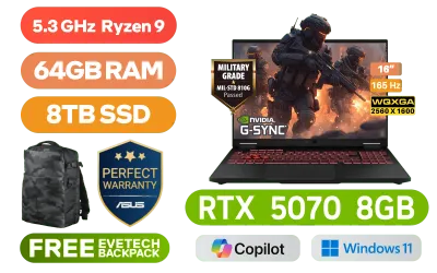 [G-SYNC] ASUS TUF Gaming A16 FA608PP AMD Ryzen 9 8940HX up to 5.3GHz Processor, 80MB Cache, 16x Cores, 32x Threads / 64GB DDR5 RAM / 8TB Ultra-Fast NVMe SSD / 16" WQXGA (2560x1600) 165Hz IPS-Level Display / NVIDIA 50 Series GeForce RTX 5070 8GB GDDR7 Dedicated Graphics / Windows 11 Home (64bit) / Realtek Wi-Fi 6E 8852CE Wireless LAN / Bluetooth 5.3 / 1080P FHD IR Camera / 3 x USB Type-A / 2x USB Type C (Supports DisplayPort™ / Power Delivery) / 1 x HDMI / 1x Headphone and Microphone Combo jack / 1x RJ-45 / RGB Backlit Keyboard / Dolby Atmos Audio with AI noise-canceling / ASUS TUF Gaming A16 FA608PP Ryzen 9 RTX 5070 Laptop Deal[G-SYNC] ASUS TUF Gaming A16 FA608PP AMD Ryzen 9 8940HX up to 5.3GHz Processor, 80MB Cache, 16x Cores, 32x Threads / 64GB DDR5 RAM / 8TB Ultra-Fast NVMe SSD / 16" WQXGA (2560x1600) 165Hz IPS-Level Display / NVIDIA 50 Series GeForce RTX 5070 8GB GDDR7 Dedicated Graphics / Windows 11 Home (64bit) / Realtek Wi-Fi 6E 8852CE Wireless LAN / Bluetooth 5.3 / 1080P FHD IR Camera / 3 x USB Type-A / 2x USB Type C (Supports DisplayPort™ / Power Delivery) / 1 x HDMI / 1x Headphone and Microphone Combo jack / 1x RJ-45 / RGB Backlit Keyboard / Dolby Atmos Audio with AI noise-canceling / ASUS TUF Gaming A16 FA608PP Ryzen 9 RTX 5070 Laptop Deal [FA608PP-91610G0W/64GB/8TB] / 3 YEARS WARRANTY / [+] GET FREE EVETECH DASH Premium Gaming Backpack / [+] Get PRAGMATA with select GeForce RTX 50 Series + FREE DELIVERY !