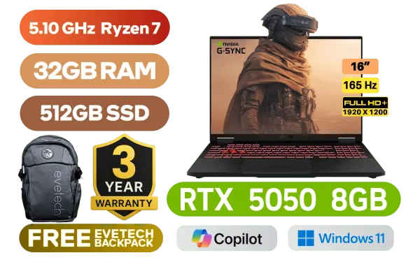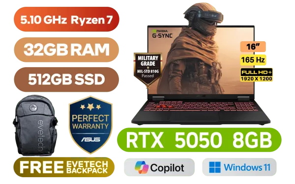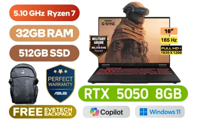 [G-SYNC] ASUS TUF Gaming A16 FA608UH AMD Ryzen 7 260 up to 5.10GHz Processor, 24MB Cache, 8x Cores, 16x Threads / 32GB DDR5 RAM / 512GB Ultra-Fast NVMe SSD / 16" FHD+ (1920x1200) Anti-Glare 165Hz IPS-Level Display / NVIDIA 50 Series GeForce RTX 5050 8GB GDDR7 Dedicated Graphics / Windows 11 Home (64bit) / 1080P FHD IR Camera / Bluetooth 5.3 / Realtek Wi-Fi 6E 8852CE Wireless LAN / 3 x USB Type-A / 2x USB Type C / 1 x HDMI 2.1 FRL / 1x Microphone and Headphone Combo jack / 1x RJ-45 / 1-Zone RGB Backlit Chiclet Keyboard / Dolby Atmos Audio with AI noise-canceling / ASUS TUF Gaming A16 Ryzen 7 RTX 5050 Gaming Laptop Deal[G-SYNC] ASUS TUF Gaming A16 FA608UH AMD Ryzen 7 260 up to 5.10GHz Processor, 24MB Cache, 8x Cores, 16x Threads / 32GB DDR5 RAM / 512GB Ultra-Fast NVMe SSD / 16" FHD+ (1920x1200) Anti-Glare 165Hz IPS-Level Display / NVIDIA 50 Series GeForce RTX 5050 8GB GDDR7 Dedicated Graphics / Windows 11 Home (64bit) / 1080P FHD IR Camera / Bluetooth 5.3 / Realtek Wi-Fi 6E 8852CE Wireless LAN / 3 x USB Type-A / 2x USB Type C / 1 x HDMI 2.1 FRL / 1x Microphone and Headphone Combo jack / 1x RJ-45 / 1-Zone RGB Backlit Chiclet Keyboard / Dolby Atmos Audio with AI noise-canceling / ASUS TUF Gaming A16 Ryzen 7 RTX 5050 Gaming Laptop Deal [FA608UH-716512G0W/32GB] / 3 YEARS WARRANTY / [+] GET FREE EVETECH FLUX Premium Gaming Backpack+ FREE DELIVERY !