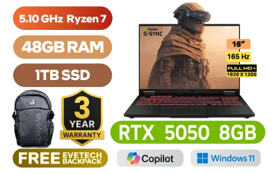 [G-SYNC] ASUS TUF Gaming A16 FA608UH AMD Ryzen 7 260 up to 5.10GHz Processor, 24MB Cache, 8x Cores, 16x Threads / 48GB DDR5 RAM / 1TB Ultra-Fast NVMe SSD / 16" FHD+ (1920x1200) Anti-Glare 165Hz IPS-Level Display / NVIDIA 50 Series GeForce RTX 5050 8GB GDDR7 Dedicated Graphics / Windows 11 Home (64bit) / 1080P FHD IR Camera / Bluetooth 5.3 / Realtek Wi-Fi 6E 8852CE Wireless LAN / 3 x USB Type-A / 2x USB Type C / 1 x HDMI 2.1 FRL / 1x Microphone and Headphone Combo jack / 1x RJ-45 / 1-Zone RGB Backlit Chiclet Keyboard / Dolby Atmos Audio with AI noise-canceling / ASUS TUF Gaming A16 Ryzen 7 RTX 5050 Gaming Laptop Deal[G-SYNC] ASUS TUF Gaming A16 FA608UH AMD Ryzen 7 260 up to 5.10GHz Processor, 24MB Cache, 8x Cores, 16x Threads / 48GB DDR5 RAM / 1TB Ultra-Fast NVMe SSD / 16" FHD+ (1920x1200) Anti-Glare 165Hz IPS-Level Display / NVIDIA 50 Series GeForce RTX 5050 8GB GDDR7 Dedicated Graphics / Windows 11 Home (64bit) / 1080P FHD IR Camera / Bluetooth 5.3 / Realtek Wi-Fi 6E 8852CE Wireless LAN / 3 x USB Type-A / 2x USB Type C / 1 x HDMI 2.1 FRL / 1x Microphone and Headphone Combo jack / 1x RJ-45 / 1-Zone RGB Backlit Chiclet Keyboard / Dolby Atmos Audio with AI noise-canceling / ASUS TUF Gaming A16 Ryzen 7 RTX 5050 Gaming Laptop Deal [FA608UH-716512G0W/48GB/1TB] / 3 YEARS WARRANTY / [+] GET FREE EVETECH FLUX Premium Gaming Backpack+ FREE DELIVERY !