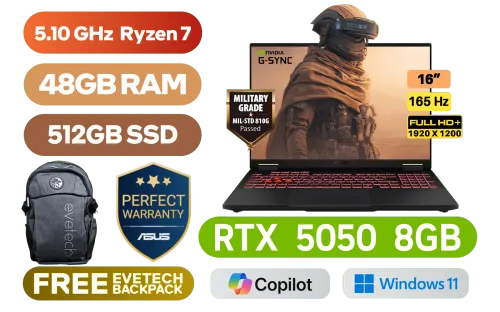 [G-SYNC] ASUS TUF Gaming A16 FA608UH AMD Ryzen 7 260 up to 5.10GHz Processor, 24MB Cache, 8x Cores, 16x Threads / 48GB DDR5 RAM / 512GB Ultra-Fast NVMe SSD / 16" FHD+ (1920x1200) Anti-Glare 165Hz IPS-Level Display / NVIDIA 50 Series GeForce RTX 5050 8GB GDDR7 Dedicated Graphics / Windows 11 Home (64bit) / 1080P FHD IR Camera / Bluetooth 5.3 / Realtek Wi-Fi 6E 8852CE Wireless LAN / 3 x USB Type-A / 2x USB Type C / 1 x HDMI 2.1 FRL / 1x Microphone and Headphone Combo jack / 1x RJ-45 / 1-Zone RGB Backlit Chiclet Keyboard / Dolby Atmos Audio with AI noise-canceling / ASUS TUF Gaming A16 Ryzen 7 RTX 5050 Gaming Laptop Deal[G-SYNC] ASUS TUF Gaming A16 FA608UH AMD Ryzen 7 260 up to 5.10GHz Processor, 24MB Cache, 8x Cores, 16x Threads / 48GB DDR5 RAM / 512GB Ultra-Fast NVMe SSD / 16" FHD+ (1920x1200) Anti-Glare 165Hz IPS-Level Display / NVIDIA 50 Series GeForce RTX 5050 8GB GDDR7 Dedicated Graphics / Windows 11 Home (64bit) / 1080P FHD IR Camera / Bluetooth 5.3 / Realtek Wi-Fi 6E 8852CE Wireless LAN / 3 x USB Type-A / 2x USB Type C / 1 x HDMI 2.1 FRL / 1x Microphone and Headphone Combo jack / 1x RJ-45 / 1-Zone RGB Backlit Chiclet Keyboard / Dolby Atmos Audio with AI noise-canceling / ASUS TUF Gaming A16 Ryzen 7 RTX 5050 Gaming Laptop Deal [FA608UH-716512G0W/48GB] / 3 YEARS WARRANTY / [+] GET FREE EVETECH FLUX Premium Gaming Backpack+ FREE DELIVERY !