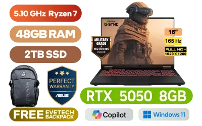 [G-SYNC] ASUS TUF Gaming A16 FA608UH AMD Ryzen 7 260 up to 5.10GHz Processor, 24MB Cache, 8x Cores, 16x Threads / 48GB DDR5 RAM / 2TB Ultra-Fast NVMe SSD / 16" FHD+ (1920x1200) Anti-Glare 165Hz IPS-Level Display / NVIDIA 50 Series GeForce RTX 5050 8GB GDDR7 Dedicated Graphics / Windows 11 Home (64bit) / 1080P FHD IR Camera / Bluetooth 5.3 / Realtek Wi-Fi 6E 8852CE Wireless LAN / 3 x USB Type-A / 2x USB Type C / 1 x HDMI 2.1 FRL / 1x Microphone and Headphone Combo jack / 1x RJ-45 / 1-Zone RGB Backlit Chiclet Keyboard / Dolby Atmos Audio with AI noise-canceling / ASUS TUF Gaming A16 Ryzen 7 RTX 5050 Gaming Laptop Deal[G-SYNC] ASUS TUF Gaming A16 FA608UH AMD Ryzen 7 260 up to 5.10GHz Processor, 24MB Cache, 8x Cores, 16x Threads / 48GB DDR5 RAM / 2TB Ultra-Fast NVMe SSD / 16" FHD+ (1920x1200) Anti-Glare 165Hz IPS-Level Display / NVIDIA 50 Series GeForce RTX 5050 8GB GDDR7 Dedicated Graphics / Windows 11 Home (64bit) / 1080P FHD IR Camera / Bluetooth 5.3 / Realtek Wi-Fi 6E 8852CE Wireless LAN / 3 x USB Type-A / 2x USB Type C / 1 x HDMI 2.1 FRL / 1x Microphone and Headphone Combo jack / 1x RJ-45 / 1-Zone RGB Backlit Chiclet Keyboard / Dolby Atmos Audio with AI noise-canceling / ASUS TUF Gaming A16 Ryzen 7 RTX 5050 Gaming Laptop Deal [FA608UH-716512G0W/48GB/2TB] / 3 YEARS WARRANTY / [+] GET FREE EVETECH FLUX Premium Gaming Backpack+ FREE DELIVERY !